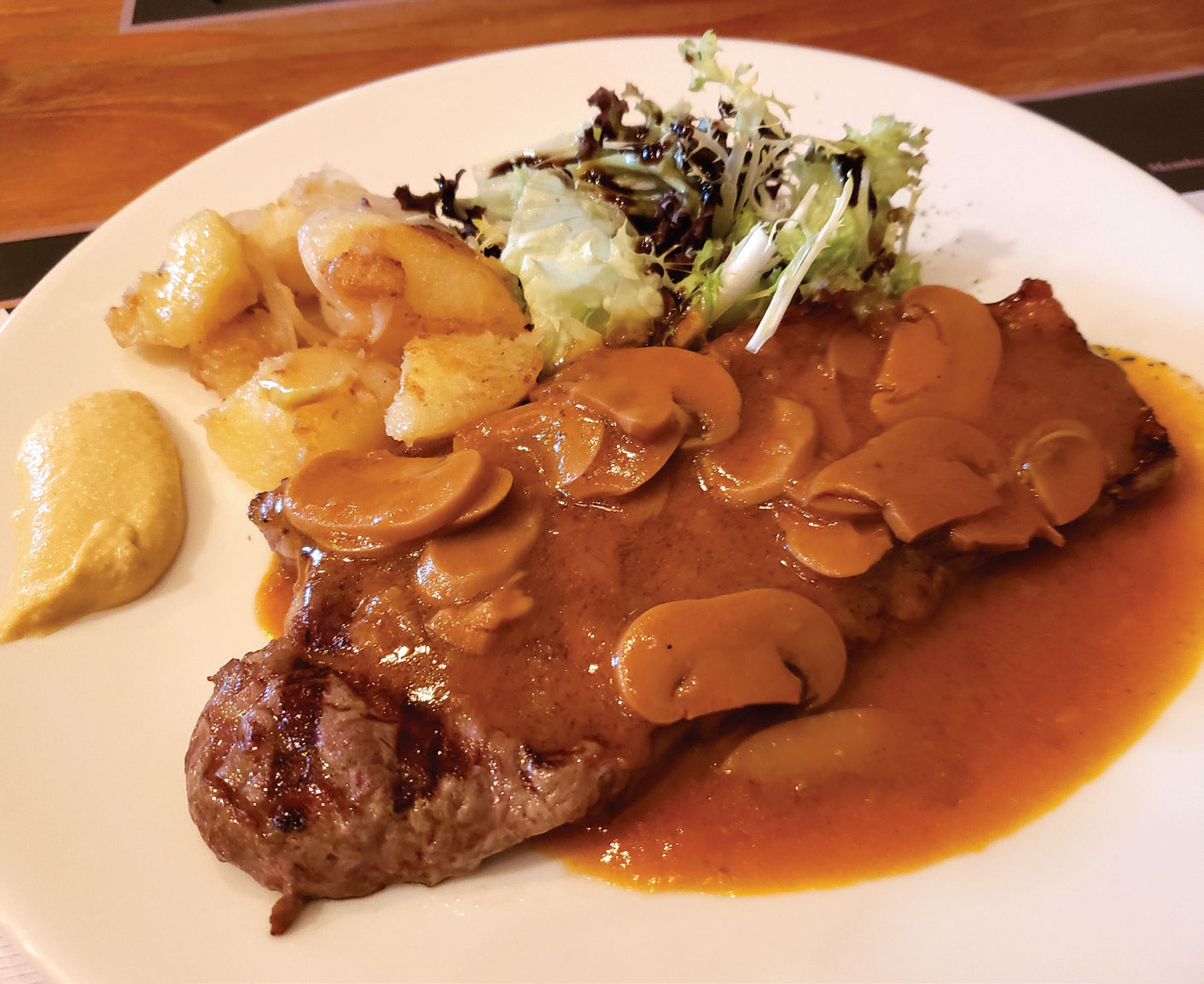 主菜牛扒薄切,肉味天然,沒有人工添加味精調味,配上磨菇汁相當合拍。