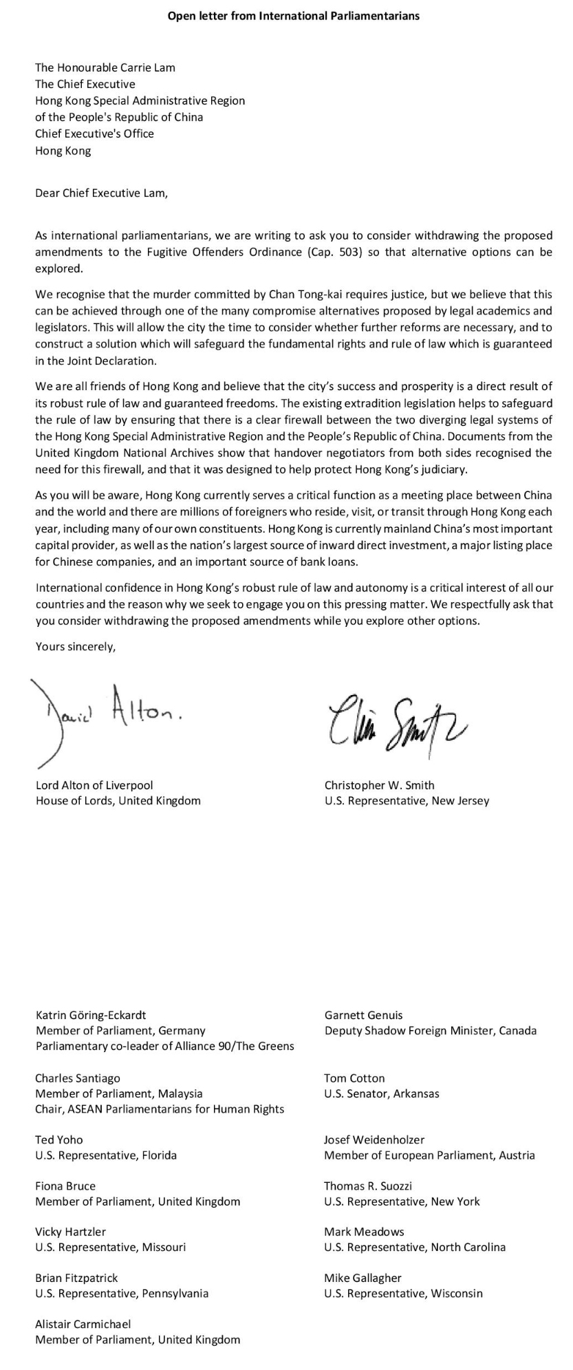 再有國際組織關注港府提出修訂逃犯條例,要求特首林鄭月娥撤回修訂。總部設於英國的「香港監察」於網上發表一封給香港特首之公開信,聯署人包括來自英、美、加、德、奧地利及馬來西亞等六個國家的15名國會議員,要求林鄭撤回修訂。