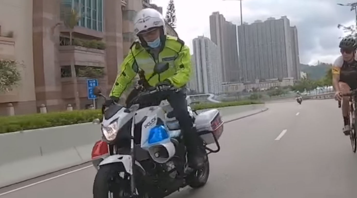 近日網上流傳影片,見到一名男子在青山公路踏單車,在旁有一名交通警於快線趕至,但該警員在電騎上卻突然站起,模仿騎單車發力上斜姿勢。警方指正了解事件,如證實有人員違規,定必嚴肅跟進。