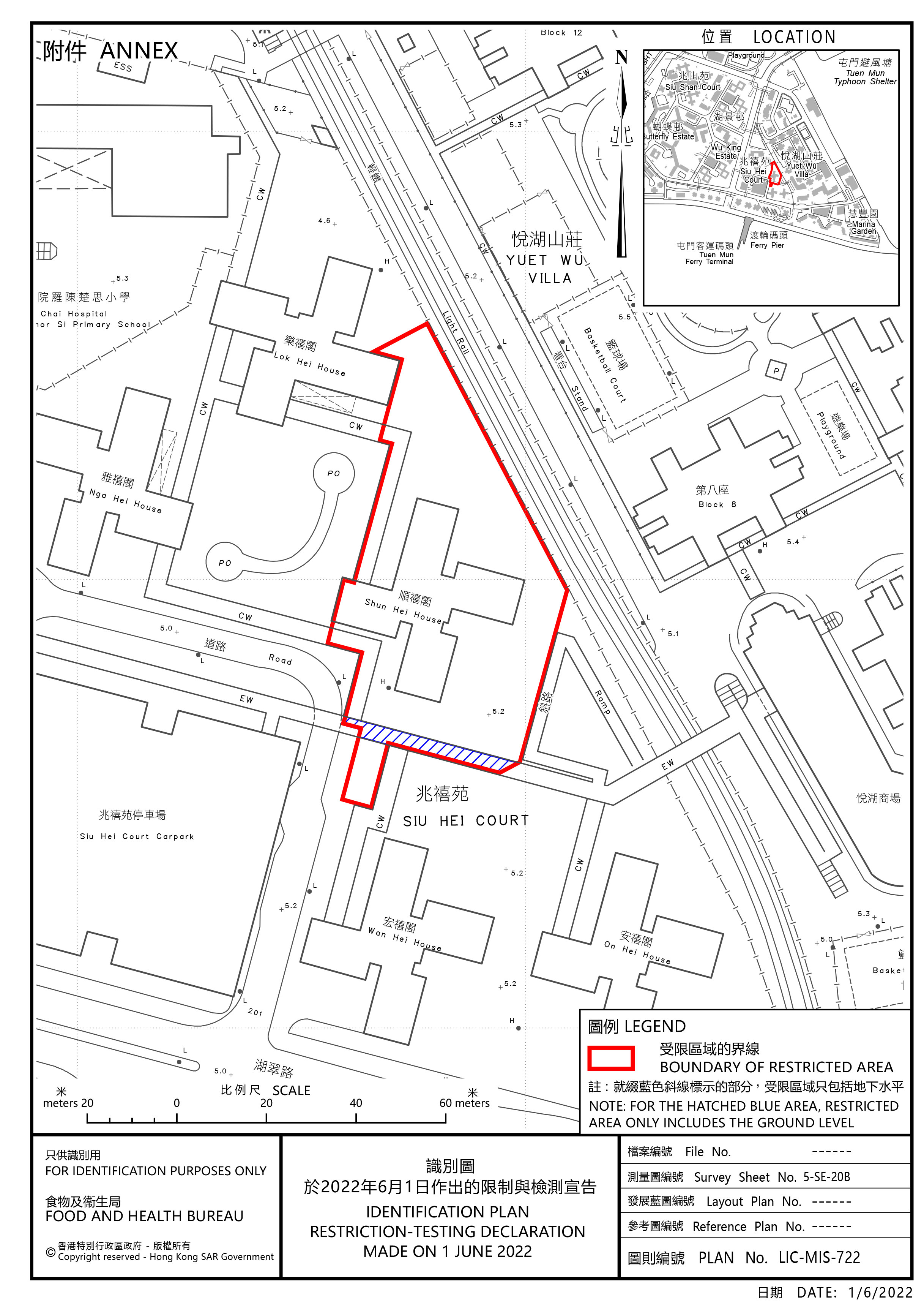 政府今日(6月1日)引用《預防及控制疾病(對若干人士強制檢測)規例》(第599J 章),作出限制與檢測宣告,自下午5時起限制在屯門指明「受限區域」,即屯門兆禧苑順禧閣內的人士,須留在其處所並接受強制檢測。受檢人士須在其處所等候,直至「受限區域」內所有已識別的受檢人士完成檢測,而相關檢測結果亦已獲大致確定,方可離開其處所。政府目標是在明日(6月2日)上午約11時完成此行動。視乎檢測結果,行動或會延長。