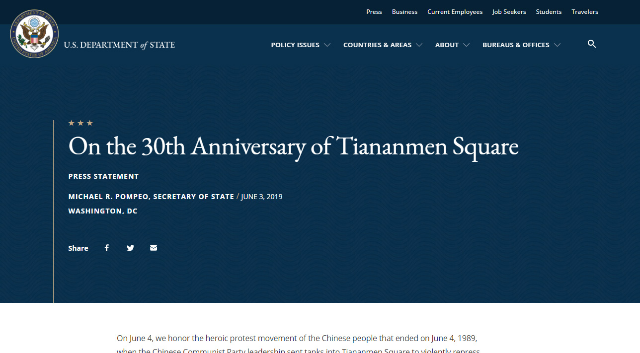 發言人耿爽又回應了美國國務卿蓬佩奧就六四事件的聲明,他批評對方惡毒攻擊中國的政治體制,大肆詆毀中國人權及宗教狀況,無端指責中國的治疆政策,嚴重干涉中國內政,踐踏國際關係基本準則,損害中美互信,中方對此堅決反對,已經向美方提出了嚴正美涉。