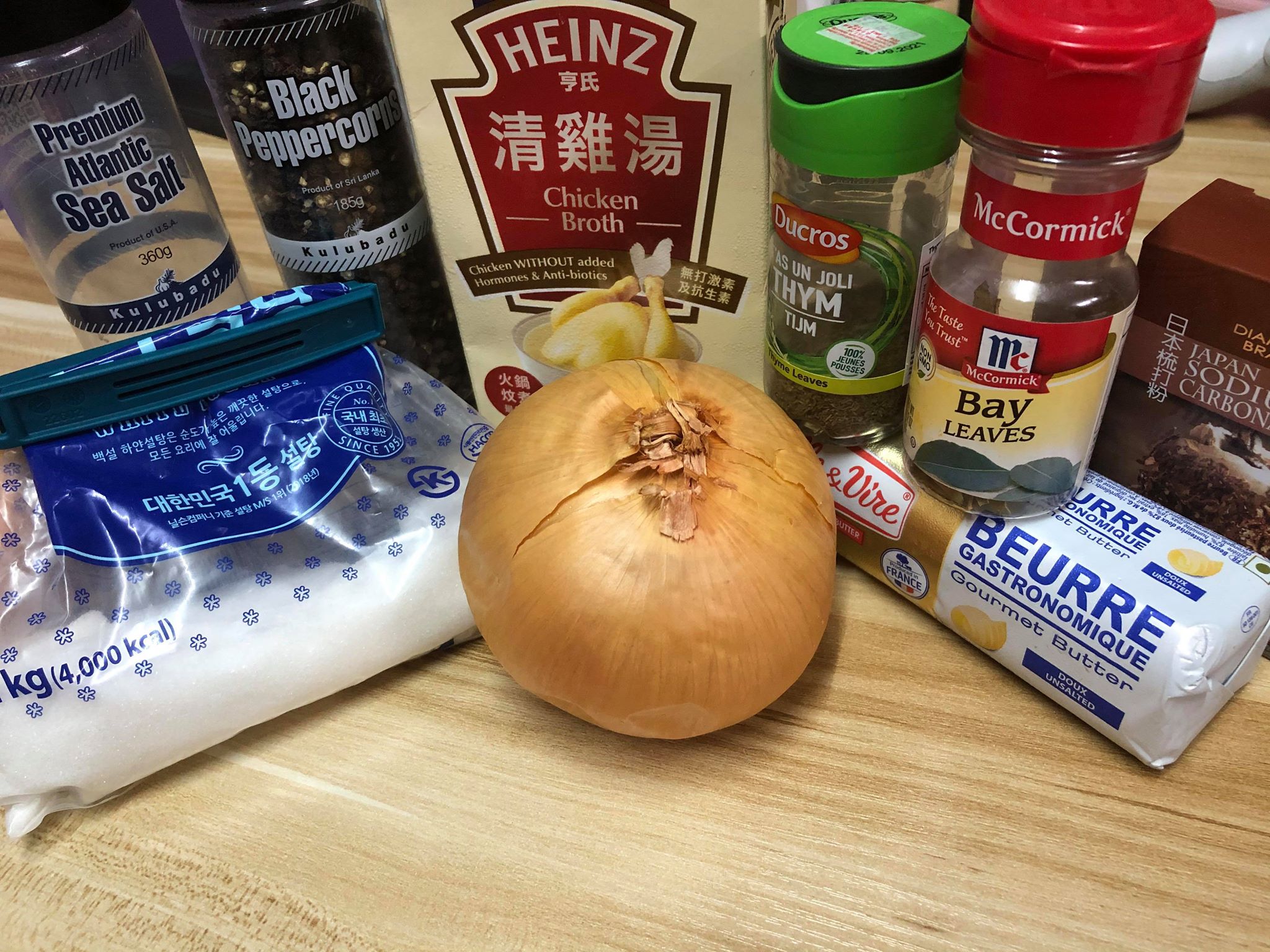 4. 洋蔥炒至金黃色後,加入水、雞湯、及白酒煮滾