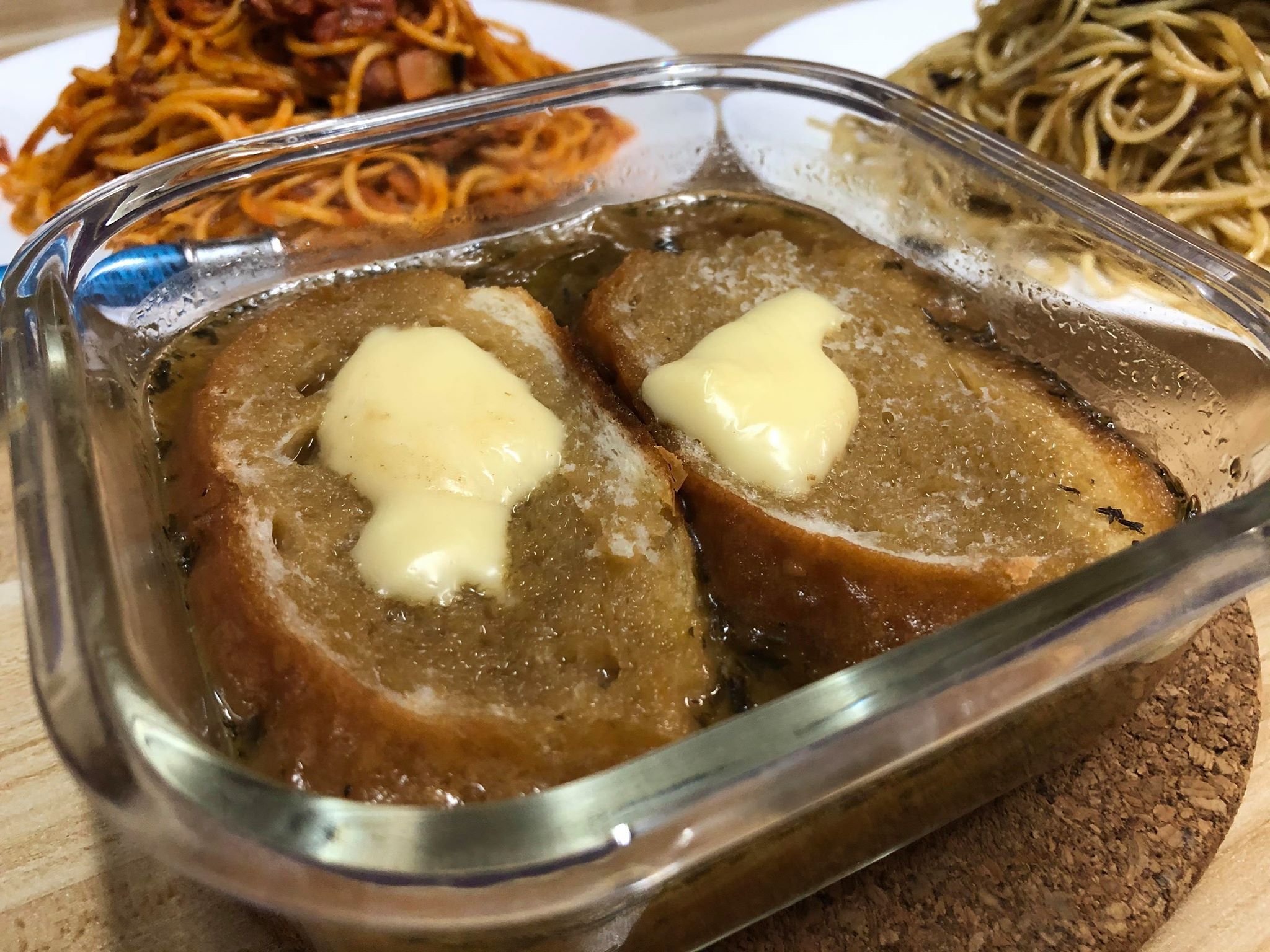 可以煎香一片法包,加上芝士後放上湯上焗約10分鐘。