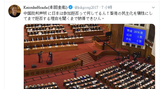 本田圭佑認為,即使犧牲香港民主,都應該要有拒絕理由,他不能接受無理由的拒絕。他留言又指,假如報道屬實,日本就很嚴重;但如果不實,報道有關消息的《共同社》就很嚴重。