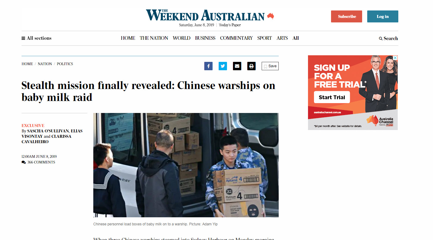 據當地媒體《澳洲人報》報道,於星期一(6月3日)早上,有三艘解放軍艦駛入悉尼港,當去到星期四,亦即船隻離開的前夕,有解放軍將多箱的奶粉搬上船,品牌包括A2 platinum和Aptamil配方奶粉。