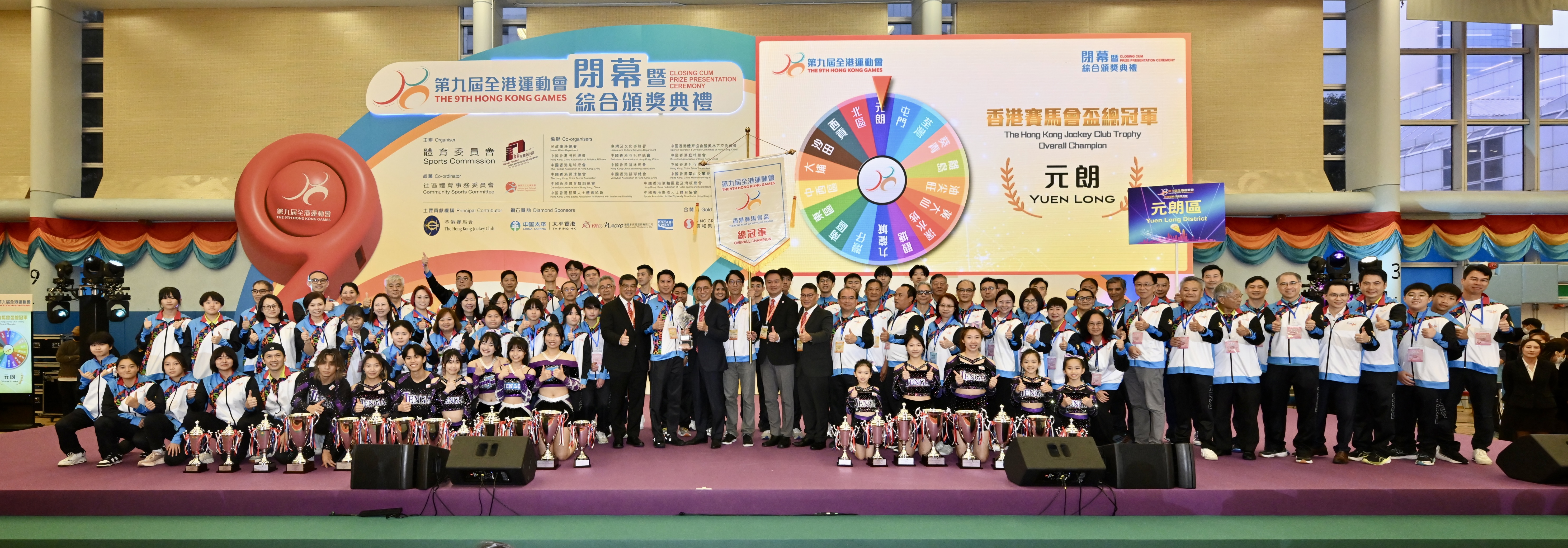 大會在典禮上頒發獎項予勝出的健兒和隊伍,表揚他們在賽事中的優秀表現。元朗區在八個體育項目的比賽中累積最高總分,贏得「第九屆全港運動會總冠軍」,總亞軍和總季軍則分別由油尖旺區和沙田區奪得。