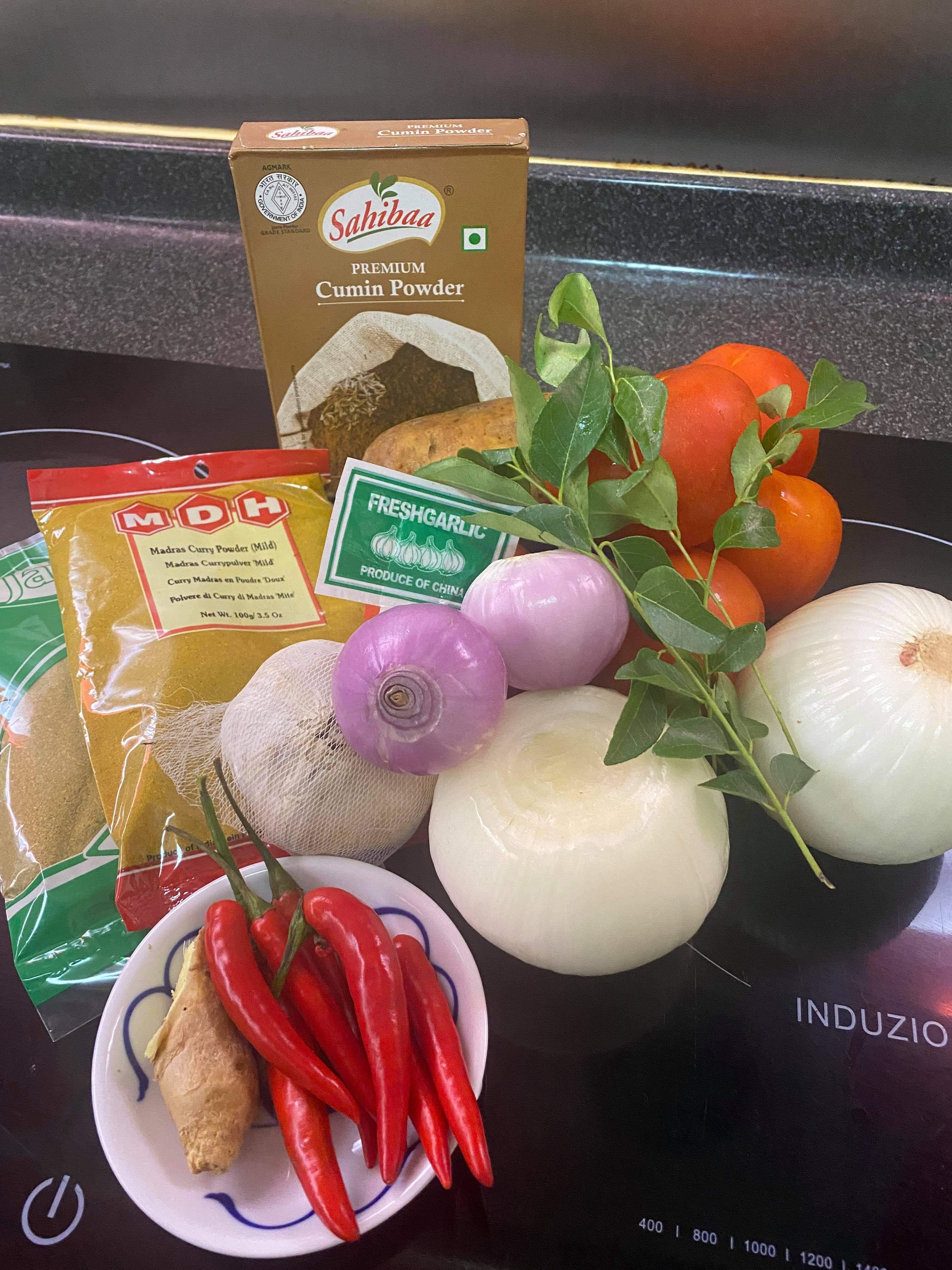 3. 再把蕃茄切細粒和咖喱粉、孜然粉、芫茜粉和咖喱葉