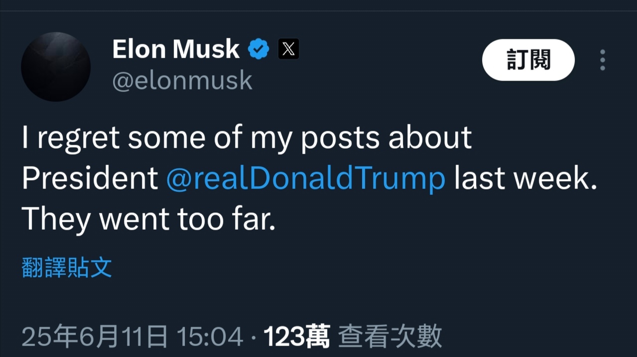 富豪馬斯克與美國總統特朗普的爭拗逐漸降溫,他於社交平台發文,稱對上周發布一些關於特朗普的帖文感到後悔,形容相關帖文太過火。