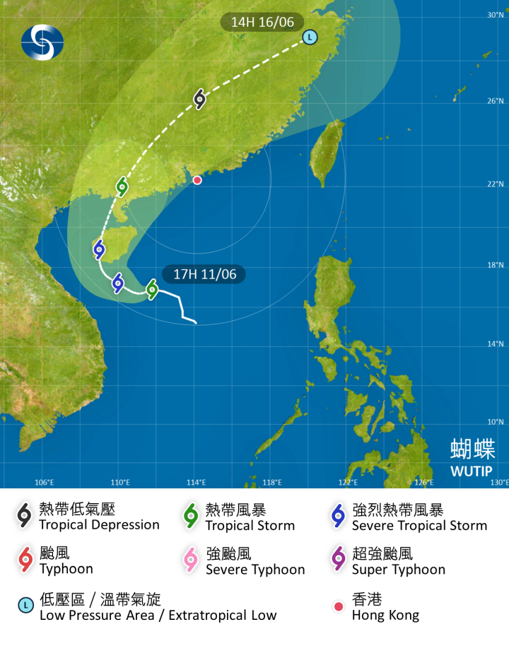 天文台表示,與「蝴蝶」相關的狂風驟雨正影響廣東沿岸。同時,「蝴蝶」正在整合中,在其廣闊環流與中國東南沿岸高壓脊的共同影響下,本港今晚至明日初時(6月12日)部分地區間中吹偏東強風,除非蝴蝶迅速增強及本地普遍持續吹強風,一號戒備信號會在今晚及明早維持。