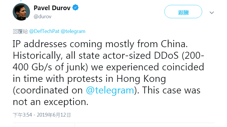 通訊平台 Telegram 昨晚表示,在周三(6月12日)香港爆發反修訂《逃犯條例》示威期間,Telegram受到強大的DDoS攻擊,而公司行政總裁Pavel Durov 今日表示,有關DDoS網絡攻擊主要來自中國,更指有關國家級攻擊與香港的示威同時發生,顯然並非個別事件。