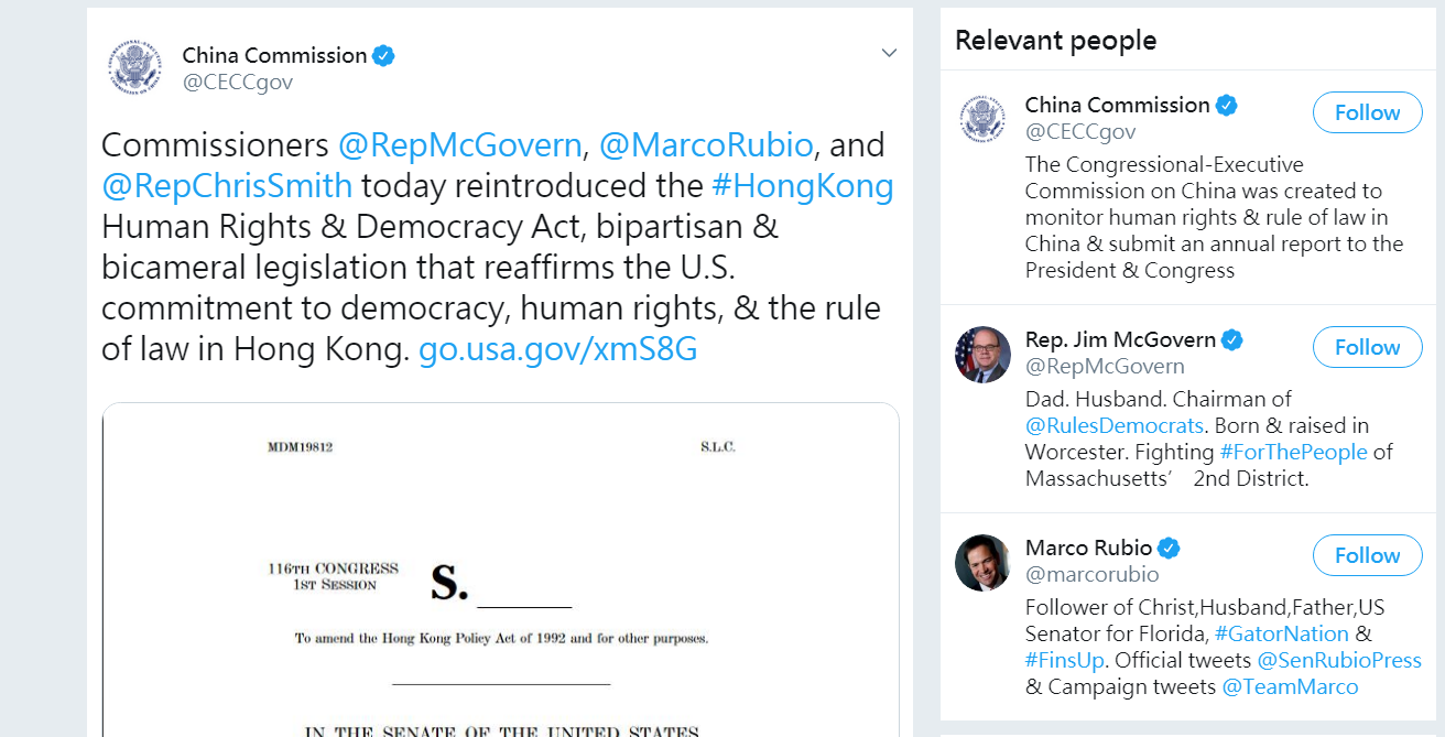(圖片來源:CECC China Commission Twitter截圖)Commissioners @RepMcGovern, @MarcoRubio, and @RepChrisSmith today reintroduced the #HongKong Human Rights & Democracy Act, bipartisan & bicameral legislation that reaffirms the U.S. commitment to democracy, human rights, & the rule of law in Hong Kong. https://t.co/Q2h0r25d7D pic.twitter.com/BSYiESZJlZ
