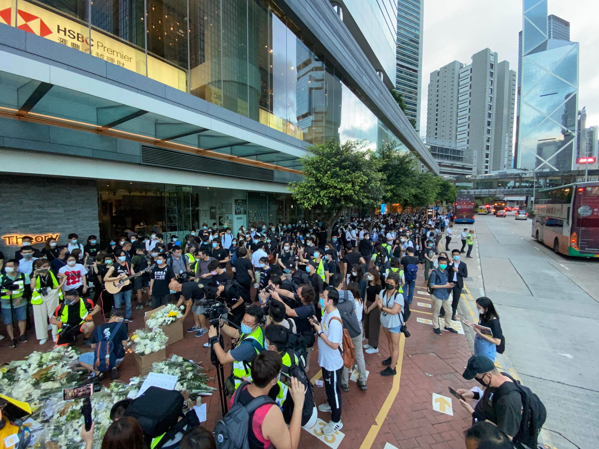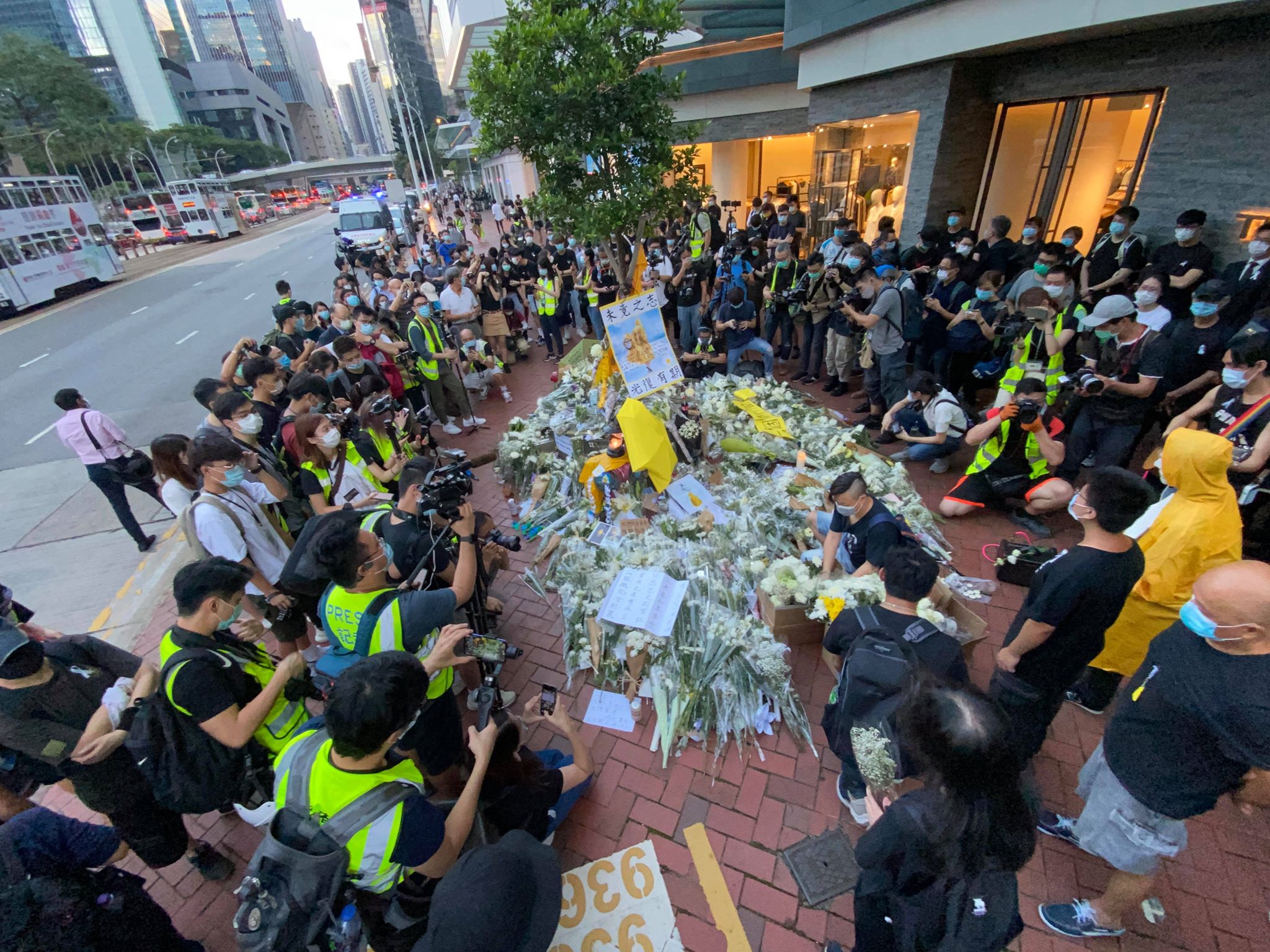 去年今日(6月15日),反對《逃犯條例》修例的男子梁凌杰,身穿黃色雨衣從太古廣場墮下身亡。今日傍晚,大批市民到金鐘廣場悼念。