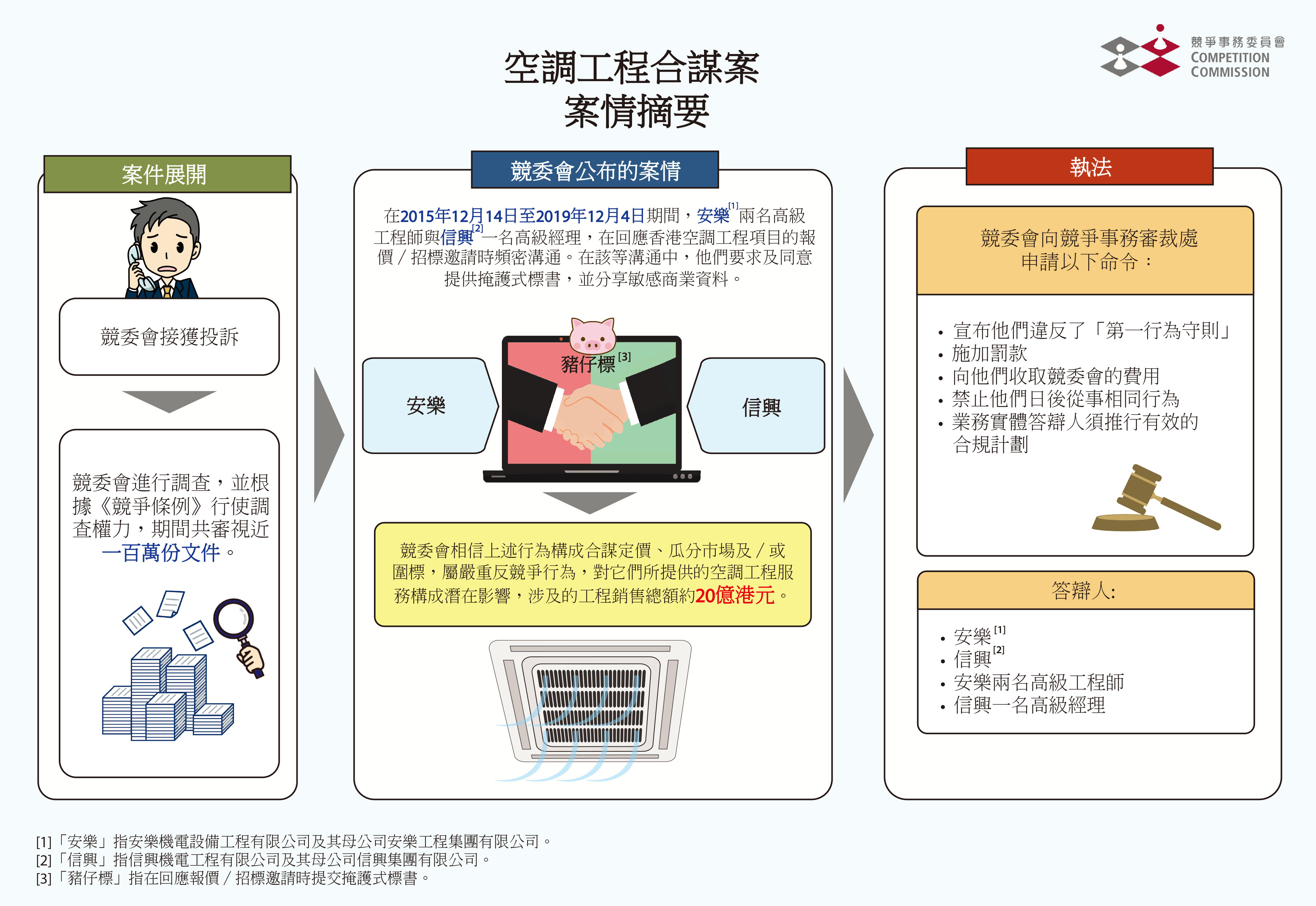 競委會現正向審裁處申請以下命令,包括宣布安樂及信興違反第一行爲守則,以及宣布佘嘉偉、鄭潔純及關兆堅牽涉入違反該守則;向他們施加罰款;向安樂及信興收取競委會的調查費用;禁止安樂及信興日後從事違反該守則的相同行爲;禁止佘嘉偉、鄭潔純及關兆堅日後從事牽涉入違反該守則的相同行爲;安樂及信興須推行有效的合規計劃;及向所有答辯人收取競委會的訟費。