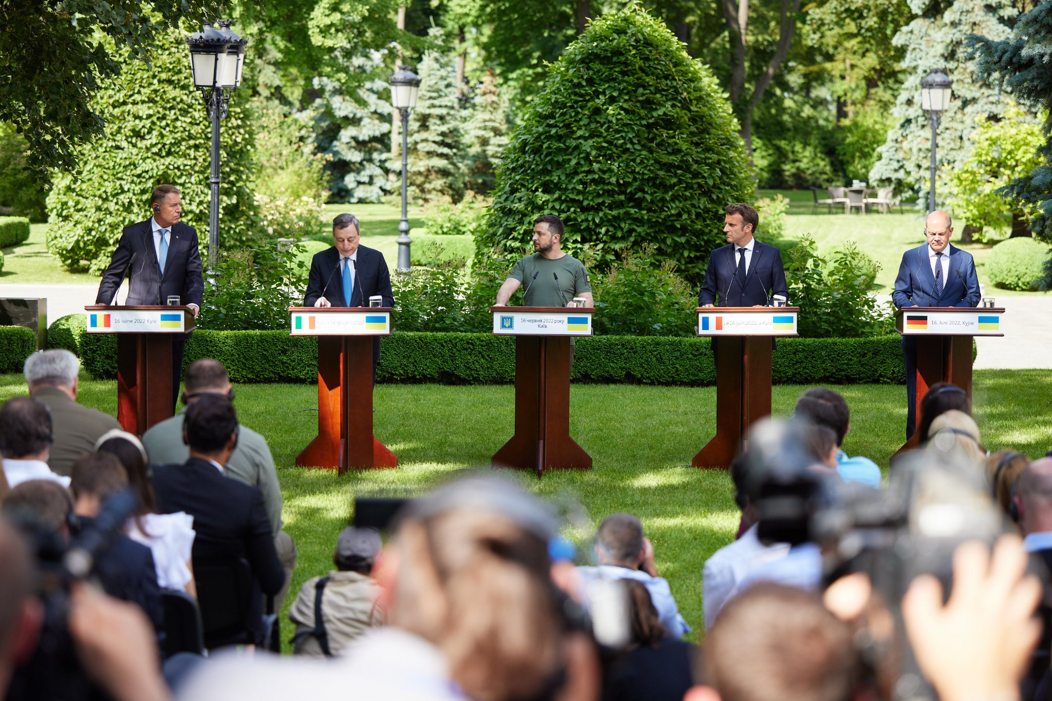 馬克龍表示,4人都支持烏克蘭立即獲得歐盟候選成員國的身分,承諾法國會額外向烏克蘭提供6座遠程凱撒自走砲,並指與俄羅斯總統普京保持溝通的重要性。