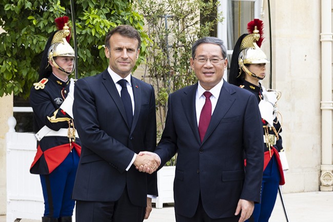 馬克龍歡迎李強訪法並出席新全球融資契約峰會,表示法方高度重視法中關係,堅持一個中國政策,願同中方通過法中戰略對話、高級別經濟財金對話、高級別人文交流機制加強協調,深化航空航天、核能、農食等領域合作。歡迎中國企業來法投資,拓展綠色環保、新能源等新興領域合作。在充滿挑戰的世界上,法中應堅持有效的多邊主義,促進國際社會團結,完善全球治理,推動解決全球性問題。