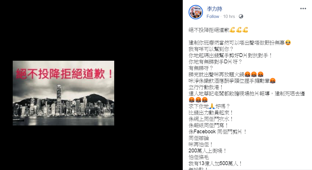 李力持在帖子中貼出一超低解像圖片,上寫有「絕不投降拒絕道歉!」八個「大字」。李要求建制派出錢幫手剪好一些影片,用來對抗對手,唔好只懂得「飲酒應酬爭頭位握手攞勳章」,需要立即行動救港。李又指雖然反修例者稱有200萬人上街,但「怕佢條毛,我有13億人加500萬人!」所以「不能認輸,絕不投降,拒絕道歉」。