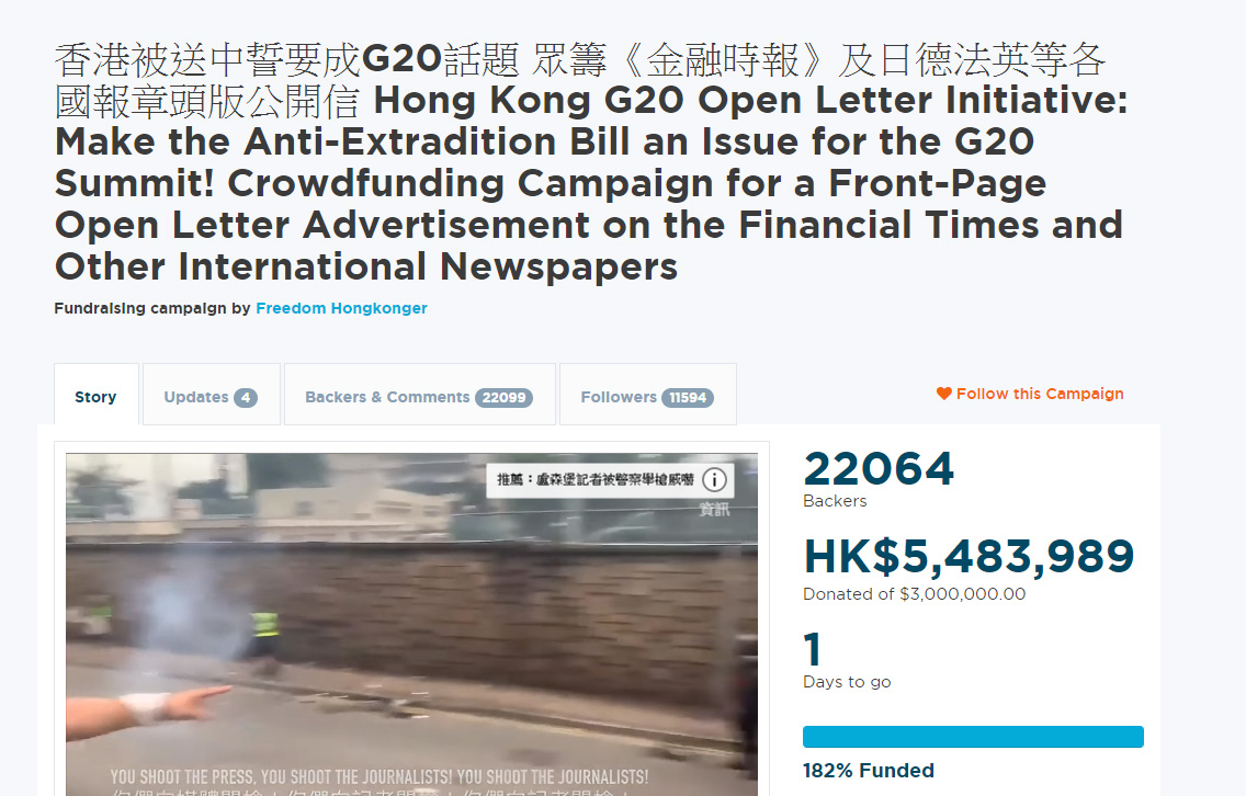 眾籌網頁已經確定,將會在6月27日的《金融時報》美國和亞洲版頭版的右下角,刊登公開信,呼籲國際社會關注《逃犯條例》風波。