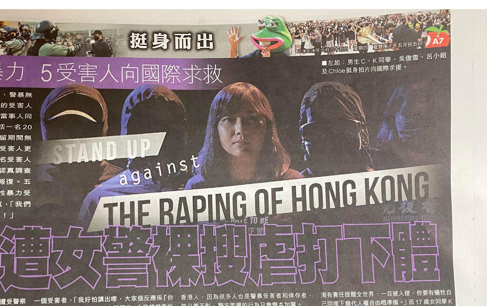 《蘋果日報》今日(6月25日)報道,以「拘捕遇性暴力 5受害人向國際求救 男生遭女警裸搜虐打下體」為題,指「一批遭受警察性暴力的受害人近日拍片向國際求救」,又稱「五人在片中促請美國為香港警察性暴力受害人發聲,制裁侵犯者和共產黨」。警方稱報道偏頗,深感憤怒。