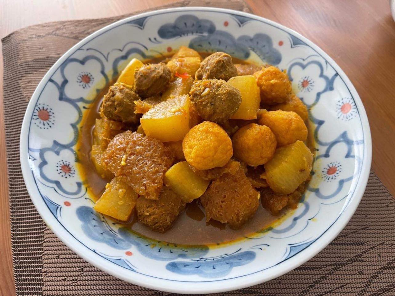 (3)鑊中落油,加入乾蔥和洋蔥碎炒至半透明,加入蒜頭一起炒至有香味,加入咖哩汁料爆香,然後遂一加入蘿蔔、豬皮和丸(每加入一種材料炒至沾上咖哩色再加下一種材料),灒酒再炒,最後加入雞湯,滾後轉中小火煮至入味,試味後作最後調味即可上碟供食。