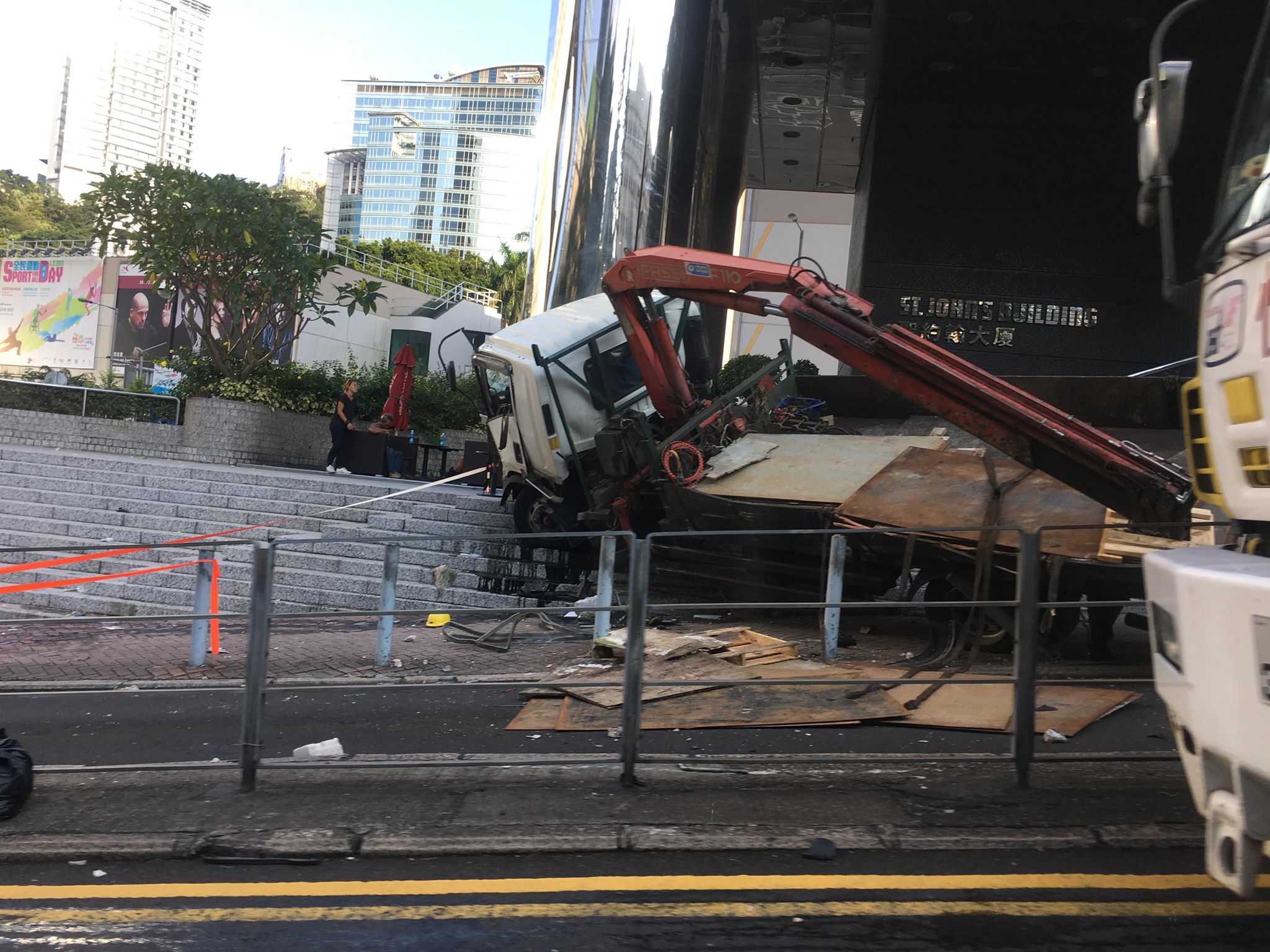 失事的吊臂車車身損毀,車身傾側停在聖若翰大廈門口的梯級上。