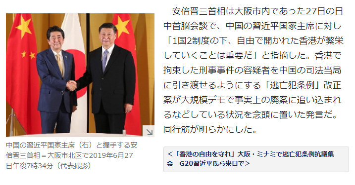 據日本多個媒體報道,日本首相安倍晉三昨日會見中國國家主席習近平期間,除了邀請對方明年春季再度訪日外,還談到了香港修例爭議。安倍晉三對習近平表示,一國兩制之下,自由與開放對香港之繁榮發展至為重要。