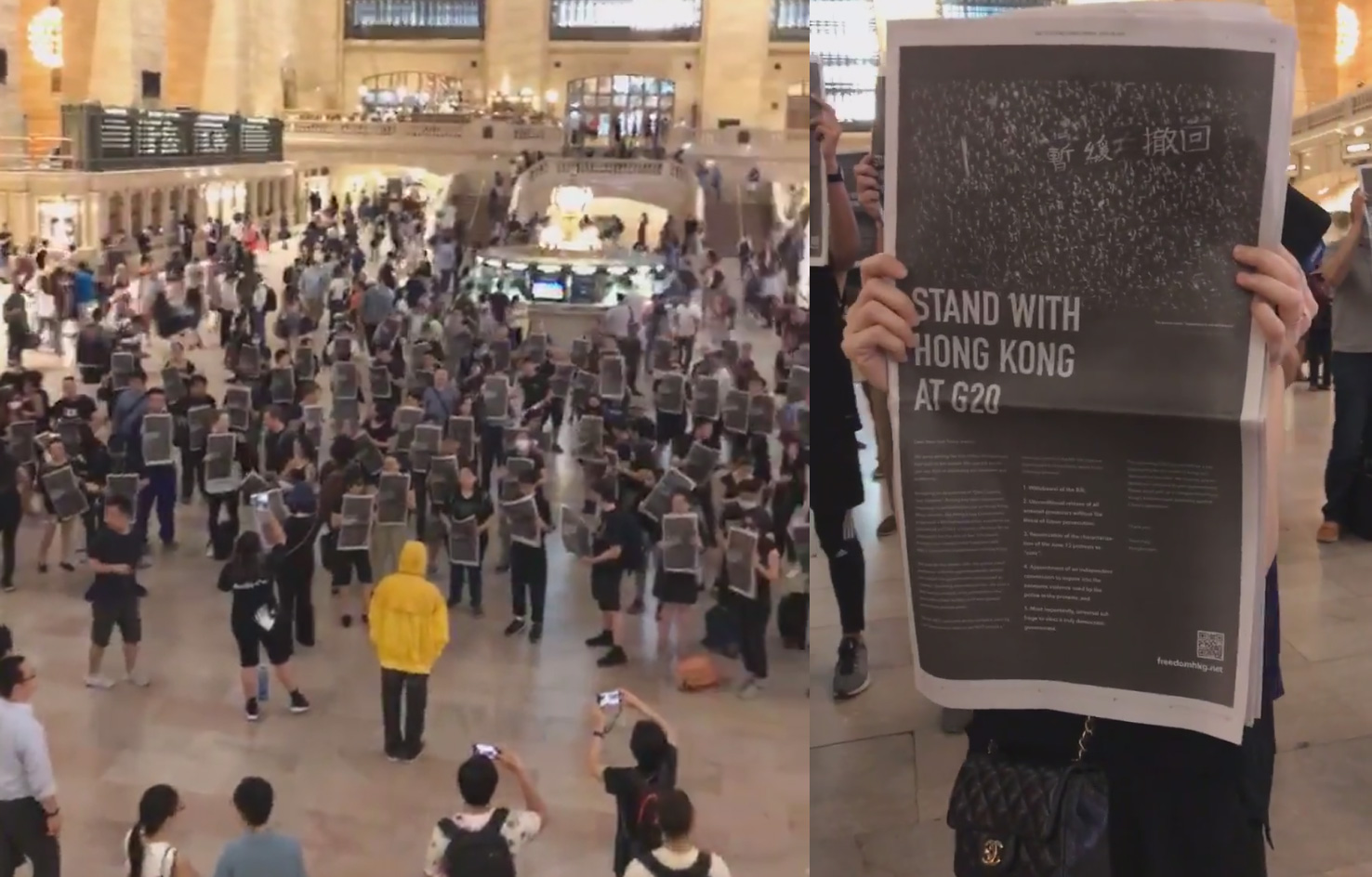 在美國時間的星期五(6月28日)晚上,有港人發起在紐約的中央車站大堂內,舉起《紐約時報》的「STAND WITH HONG KONG AT G20」的全版廣告,有數十人參與。