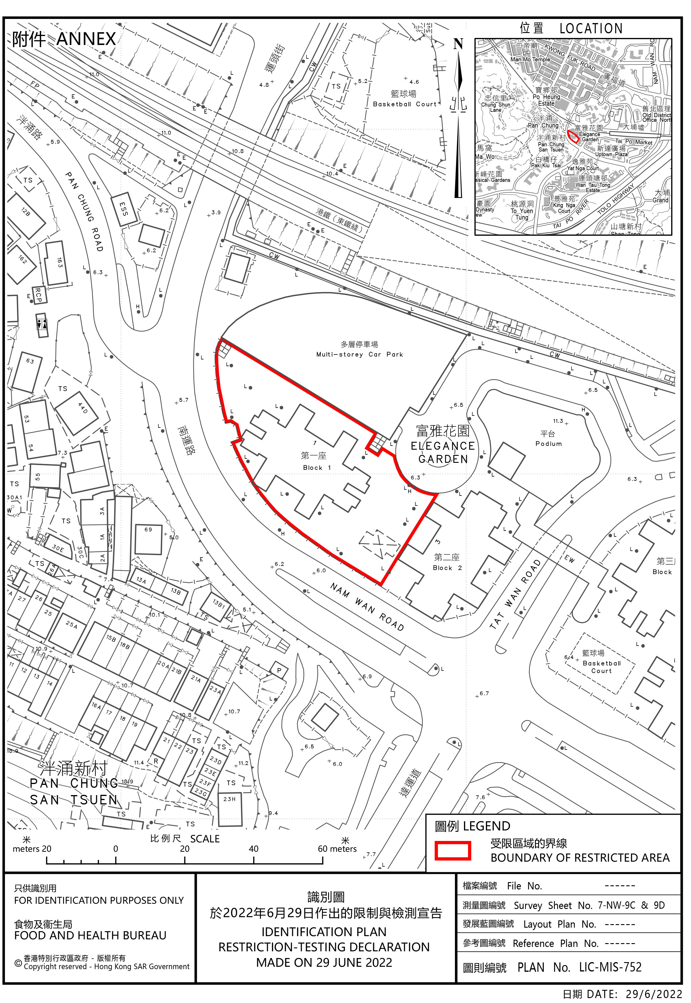 政府今日(6月29日)引用《預防及控制疾病(對若干人士強制檢測)規例》(第599J章),作出限制與檢測宣告,自下午6時起限制在大埔指明「受限區域」,即大埔富雅花園第一座內的人士,須留在其處所並接受強制檢測。受檢人士須在其處所等候,直至「受限區域」內所有已識別的受檢人士完成檢測,而相關檢測結果亦已獲大致確定,方可離開其處所。政府目標是在明日(6月30日)上午約10時完成此行動。視乎檢測結果,行動或會延長。