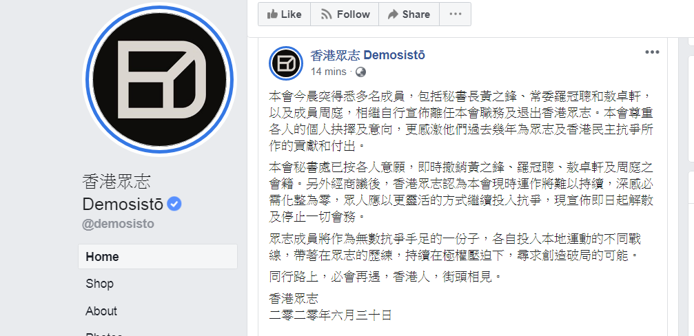 香港眾志秘書處已按各人意願,即時撤銷黃之鋒、羅冠聰、敖卓軒及周庭之會籍。另外經商議後,香港眾志認為現時運作將難以持續,深感必需化整為零,眾人應以更靈活的方式繼續投入抗爭,現宣佈即日起解散及停止一切會務。