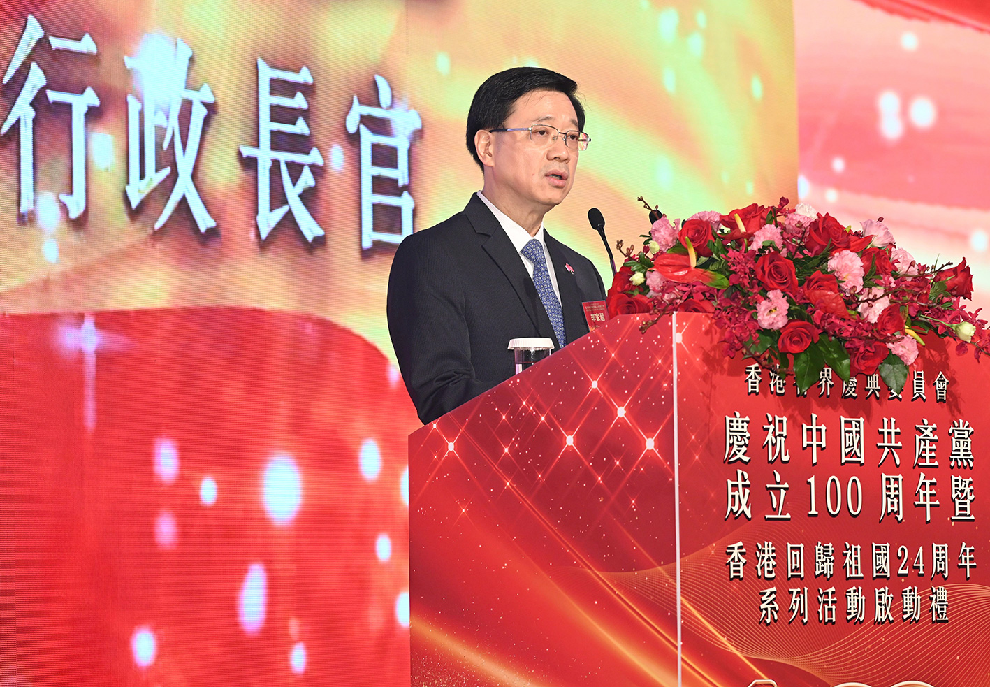 署理行政長官李家超今早(7月1日)出席香港各界慶典委員會慶祝中國共產黨成立100周年活動時致辭,他指中國共產黨自1921年成立以來,由建黨之初的50多名黨員,發展成為今天擁有超過9000萬名黨員,成為世界上最大的執政黨,帶領中華民族從站起來、富起來到強起來的偉大飛躍,邁向國際。
