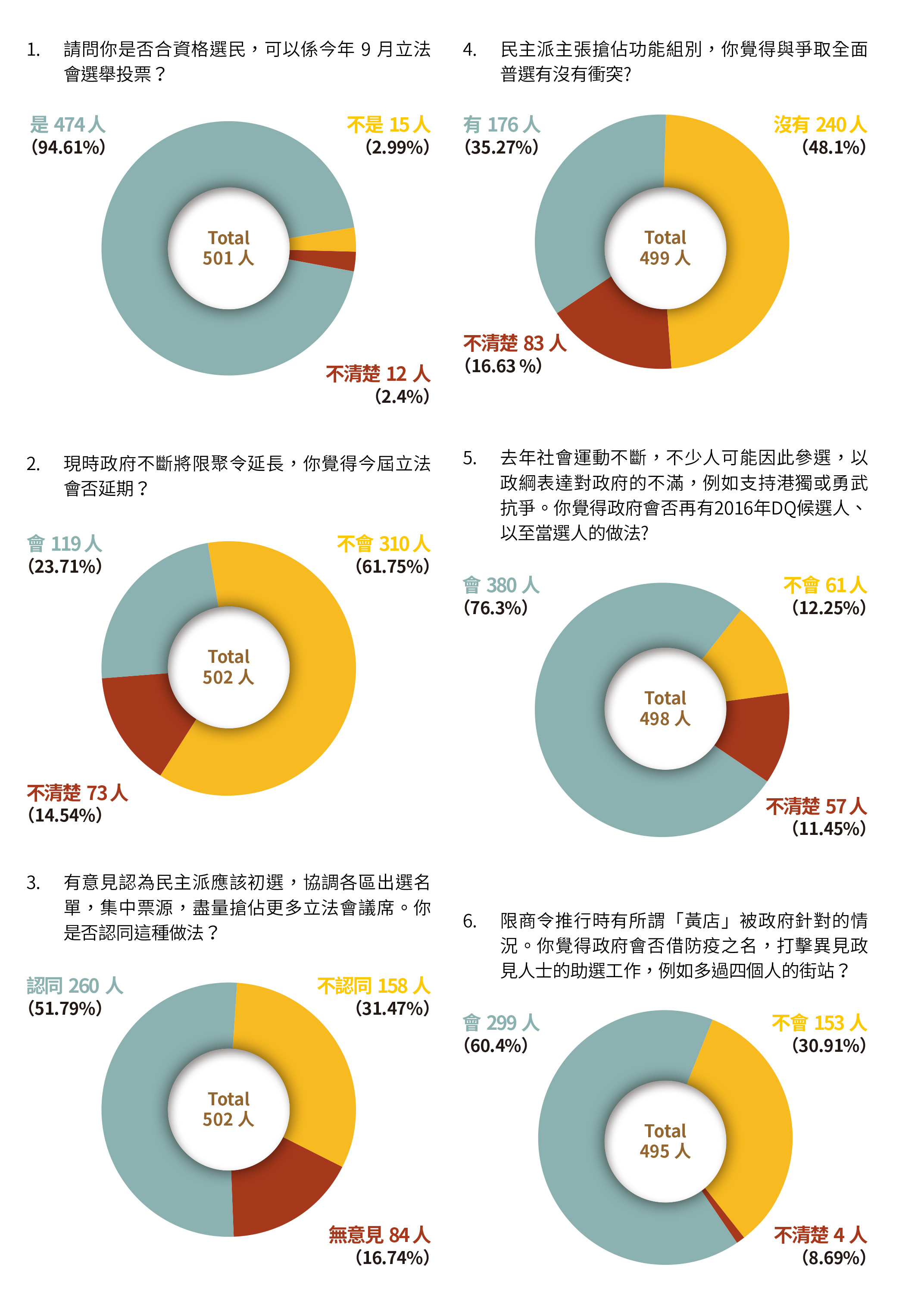 受訪者之中,有六成人(310人,61.75%)認為即使現時政府不斷將限聚令延長,今屆立法會也不會延期,認為會的不足兩成半(119人,23.71%),不清楚的有一成半(73人,14.54%)人。較多人認為不會延期,或有幾種可能性:一是市民普遍認為疫情不會持續至9月,或到9月時已不太嚴重;二是立法會選舉的重要性,令政府不敢輕言延期。