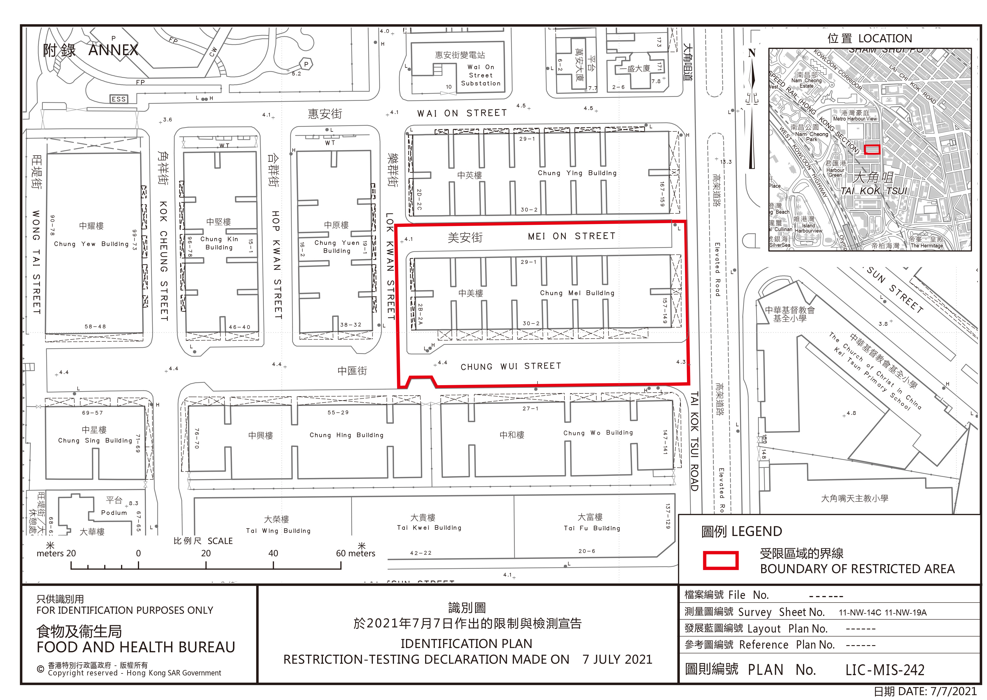 政府今日(7月7日)再引用《預防及控制疾病(對若干人士強制檢測)規例》(第599J章),作出限制與檢測宣告,自晚上7時起限制在大角咀指明「受限區域」,即大角咀道149-157號中美樓內的人士須留在其處所並接受強制檢測。受檢人士須在其處所等候,直至「受限區域」內所有已識別的受檢人士完成檢測,而相關檢測結果亦已獲大致確定,方可離開其處所。政府目標是在明日(7月8日)上午約7時完成此行動。