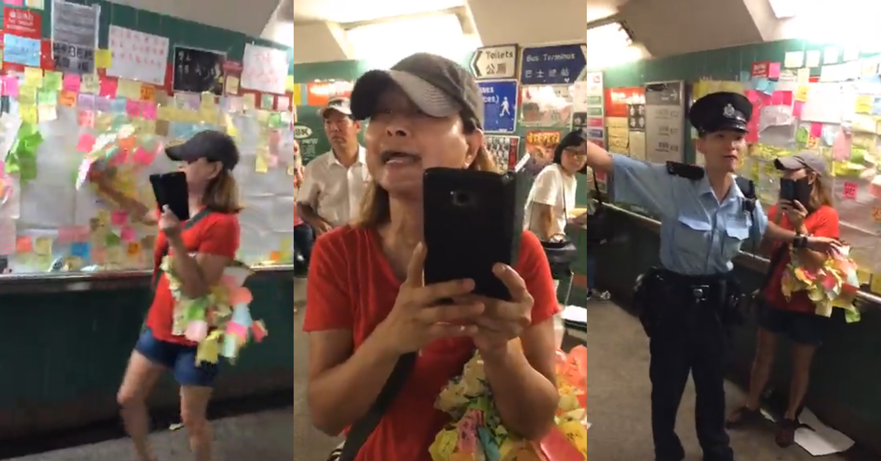 因該紅衣女子不停破壞連儂牆之報示貼,大批正上班的市民將她包圍,最終需要報警求助,警員到場後,將該名女子帶上警車離開,而一批市民即時將連儂牆修復。