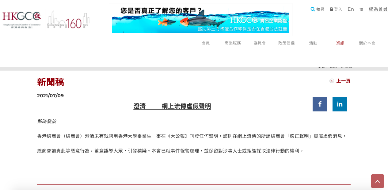香港總商會今日(7月9日)發聲明,就網上流傳上述的「嚴正聲明」澄清,未有就聘用香港大學畢業生一事在《大公報》刊登任何聲明,該則在網上流傳的所謂香港總商會的「嚴正聲明」實屬虛假消息。又表示讉責此等惡意行為,蓄意誤導大眾,引發猜疑,並已就事件報警處理,同時保留對涉事人士或組織採取法律行動的權利。
