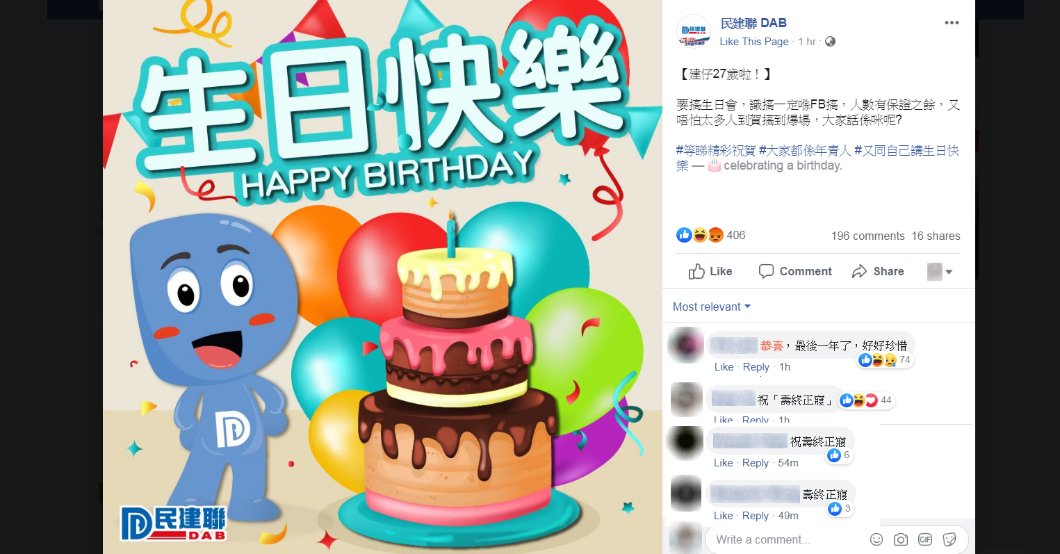 因民建聯支持《逃犯條例》修訂,遭不滿修例的市民網上抨擊,今日(7月10日)民建聯為慶祝成立27年,在Facebook登圖宣傳,市民亦趁機網上揶揄追擊,如留言祝「壽終正寢」、又有人留言「恭喜,最後一年了,好好珍惜。