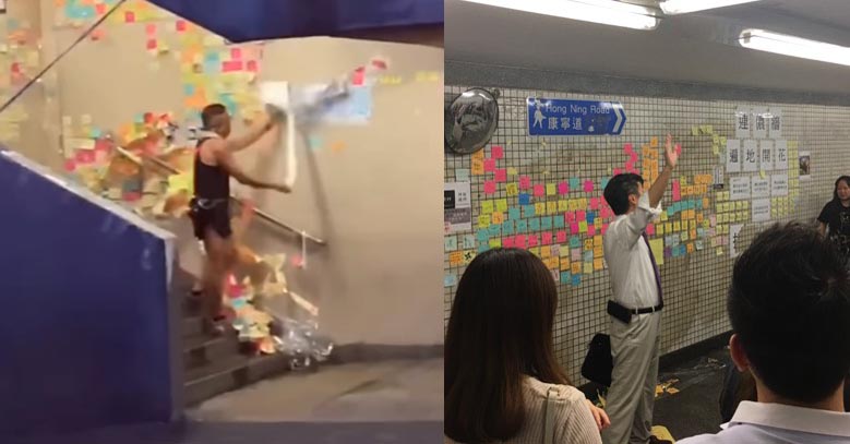 此外,一名男子今早約10時,撕走位於觀塘創紀之城1期對出隧道之連儂牆上之報示貼,遭途經市民包圍喝止時,反指被人打報警,需由警員保護離開。