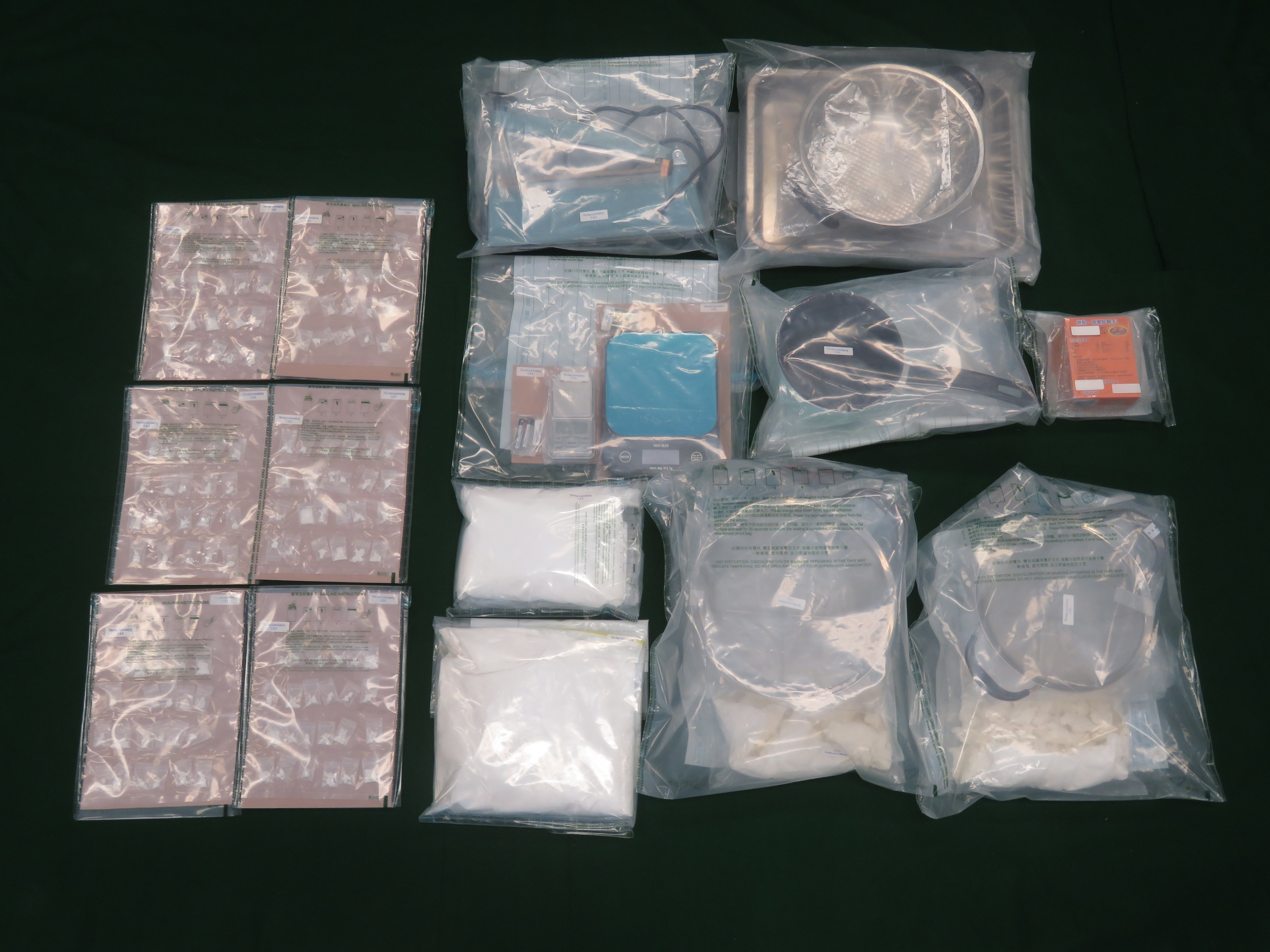 其後,海關人員押解該名被捕男子到附近一個住宅單位進行搜查,再檢獲約1.1公斤懷疑可卡因、約520克懷疑霹靂可卡因和一批製毒及包裝工具,並拘捕單位內一名懷疑涉案的21歲男子。