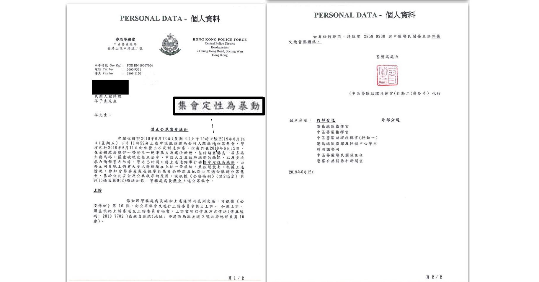 民陣發言人岑子杰表示,港府高層多次指未有將612事件定性為暴動,但警方早前反對民陣舉行集會之回覆信件中,清楚寫明因為「警方已於同日將上述地點舉行的集會定性為暴動」,故拒絕民陣申請在6月13日舉行集會,證明港府指未有將612定性暴動之說法是講大話。