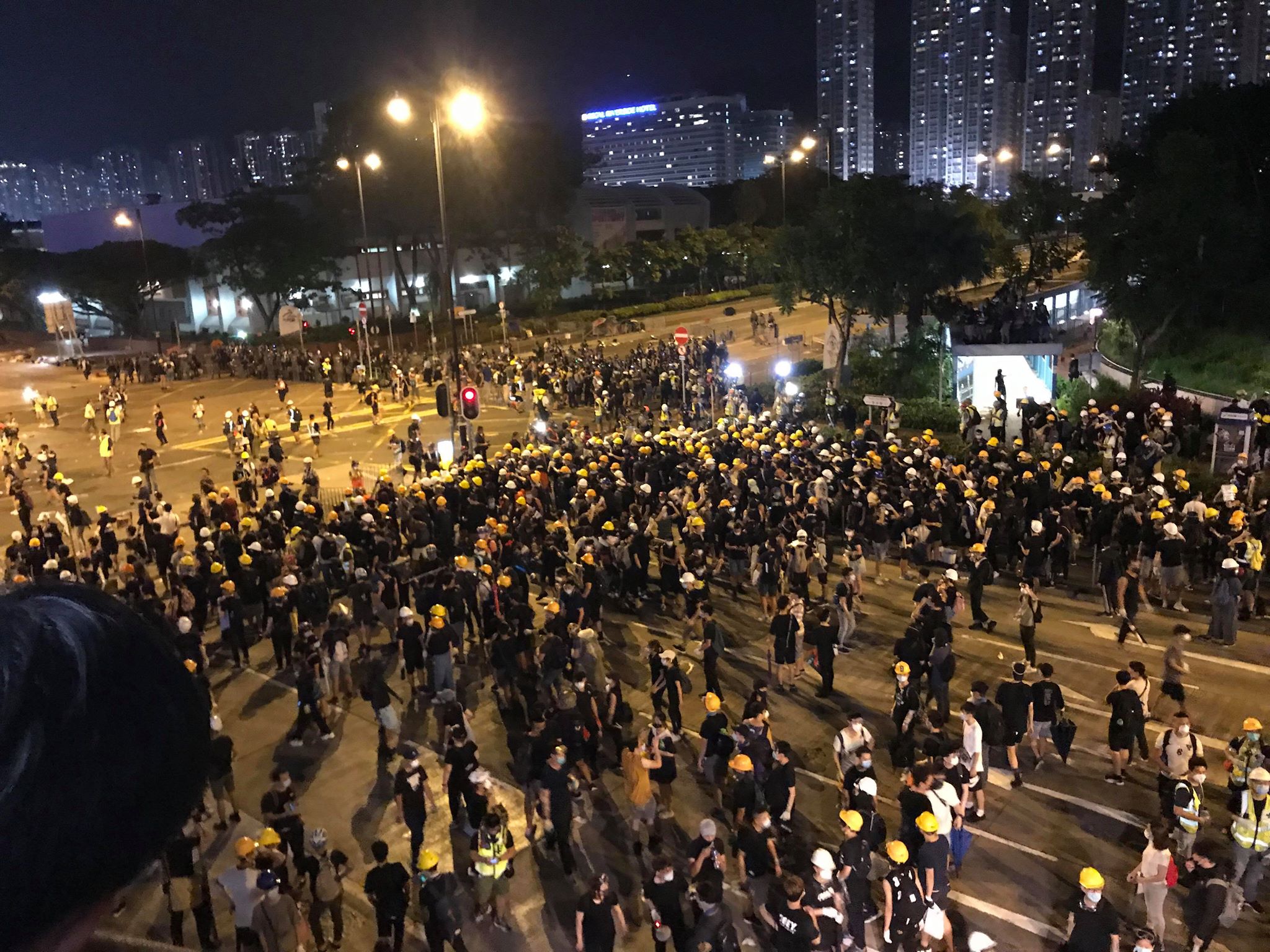 警方表示,昨日有大批人士在沙田鄉事會路、源禾路及橫壆街一帶非法集結,有人在短時間內有預謀地及大規模派發頭盔、眼罩等裝備,並在現場掘起路面磚塊、收集大量鐵枝及其他攻擊性武器,拆毀附近鐵欄,以鐵欄及其他雜物堵塞道路。同時一批暴力示威者蓄意使用交通圓錐筒和不知名粉末等不同物品主動襲擊警察,並衝擊警方防線。
