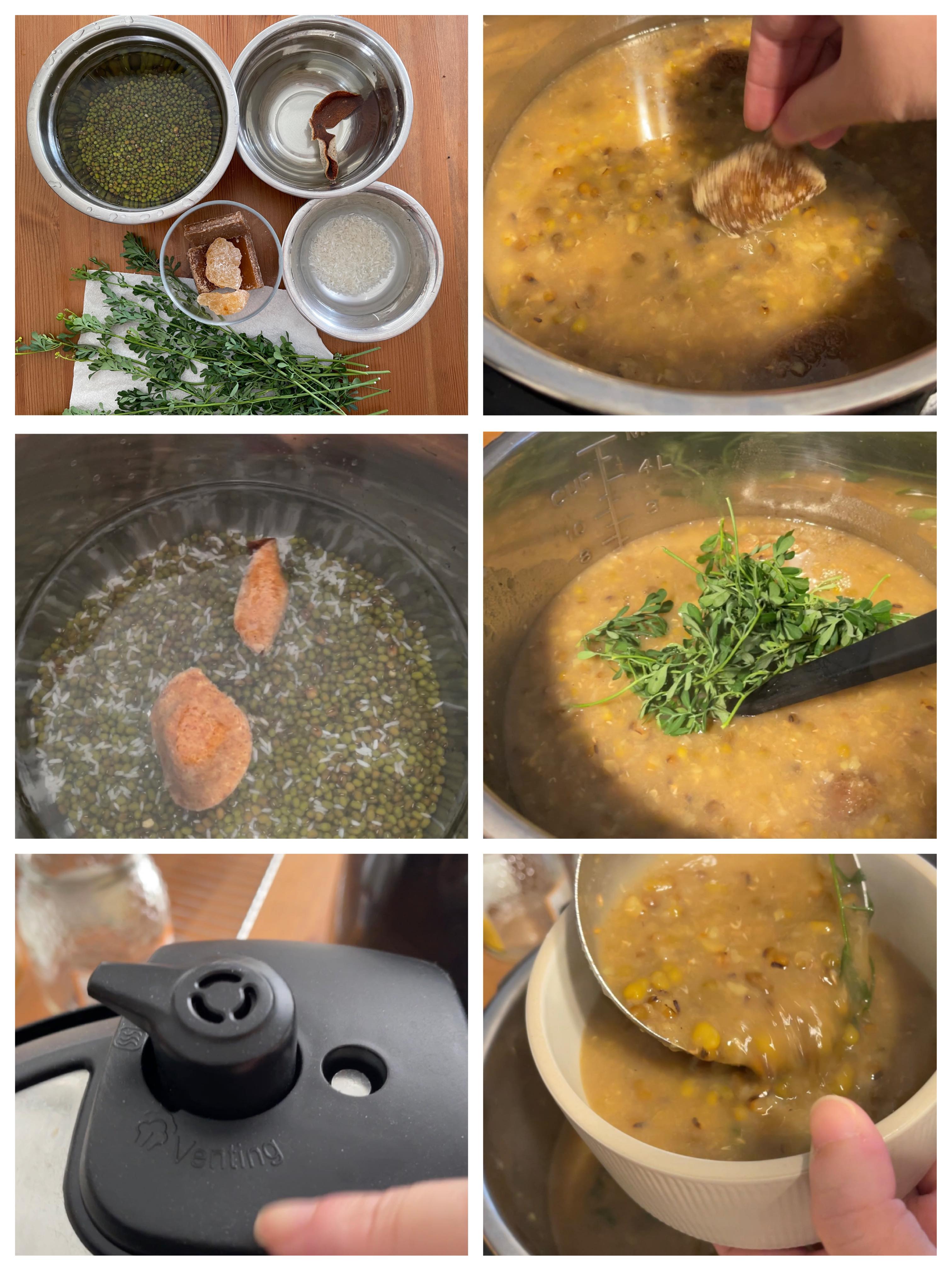 (4)將綠豆/米和2公升水倒入電子壓力煲,電子壓力煲蓋上蓋,關氣閥,用煮粥功能(Porridge)煮25分鐘。(如不用電子壓力煲,可以用煲煮,中火煮至滾轉小火煮1小時30分鐘至2小時,重要睇火)