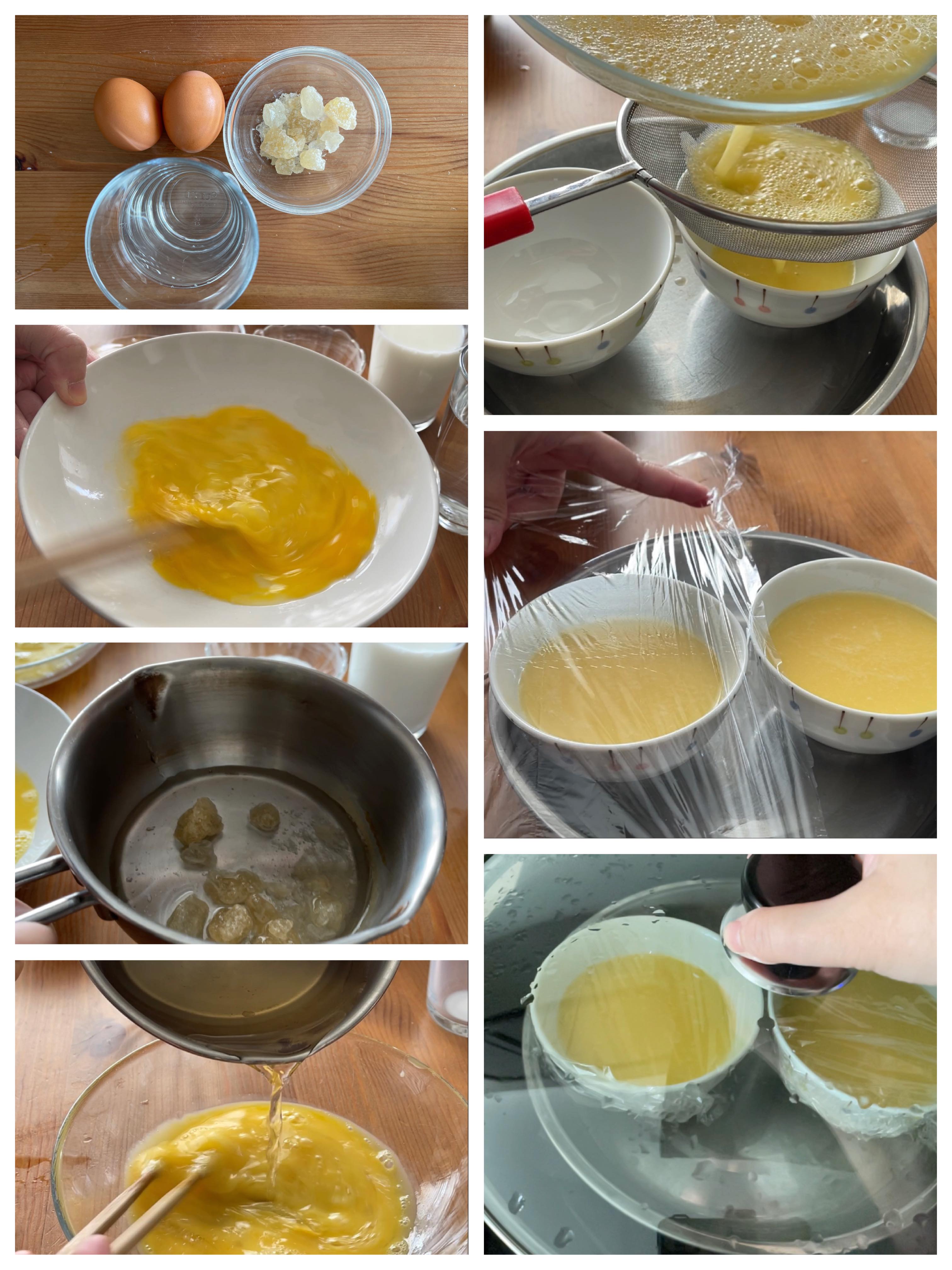 (1)蛋打散發勻,將半份水加入冰糖煮至糖溶,再倒入另半份水(糖水就會降溫至微暖),將糖水慢慢加入蛋中,拌勻。