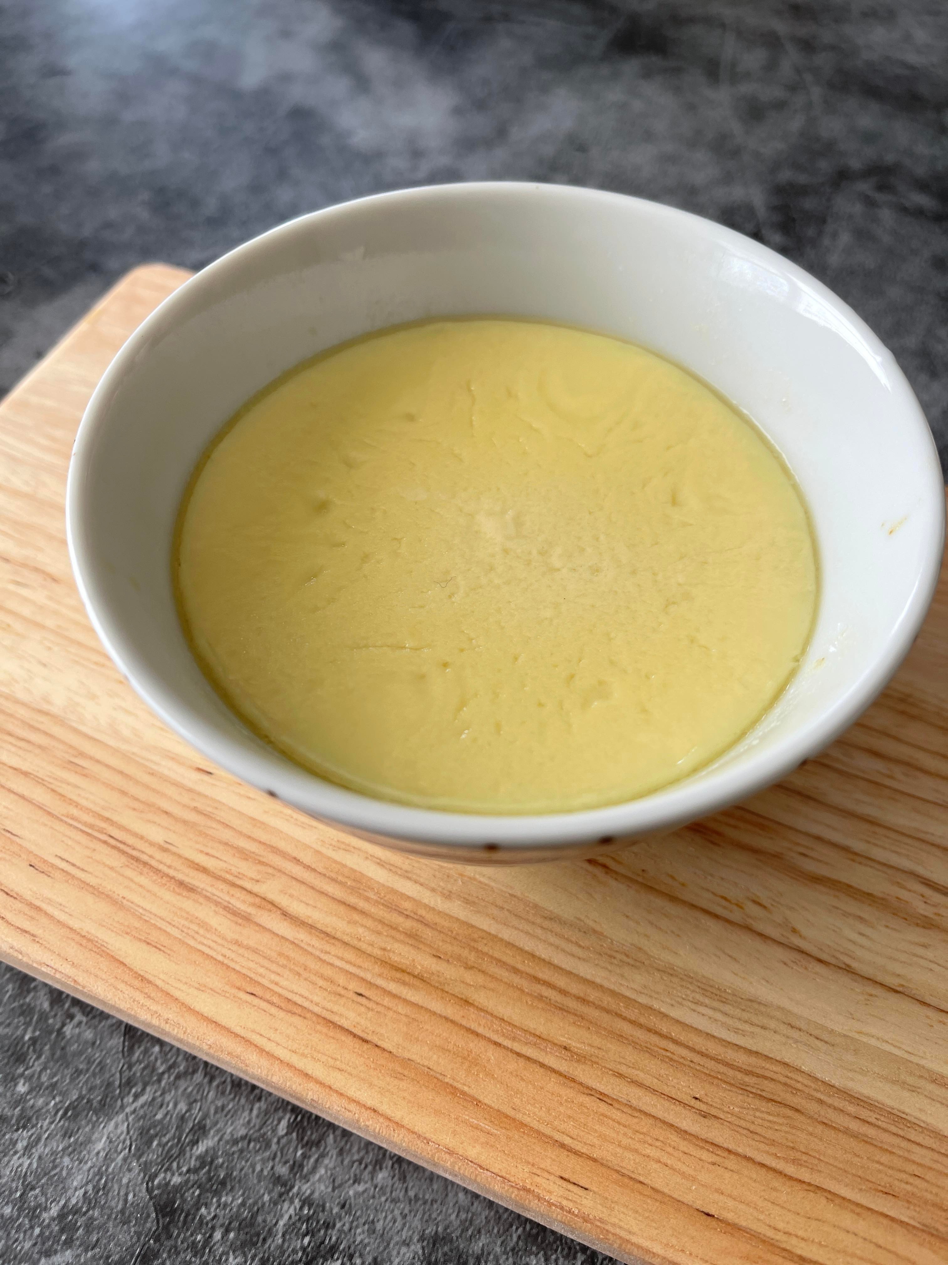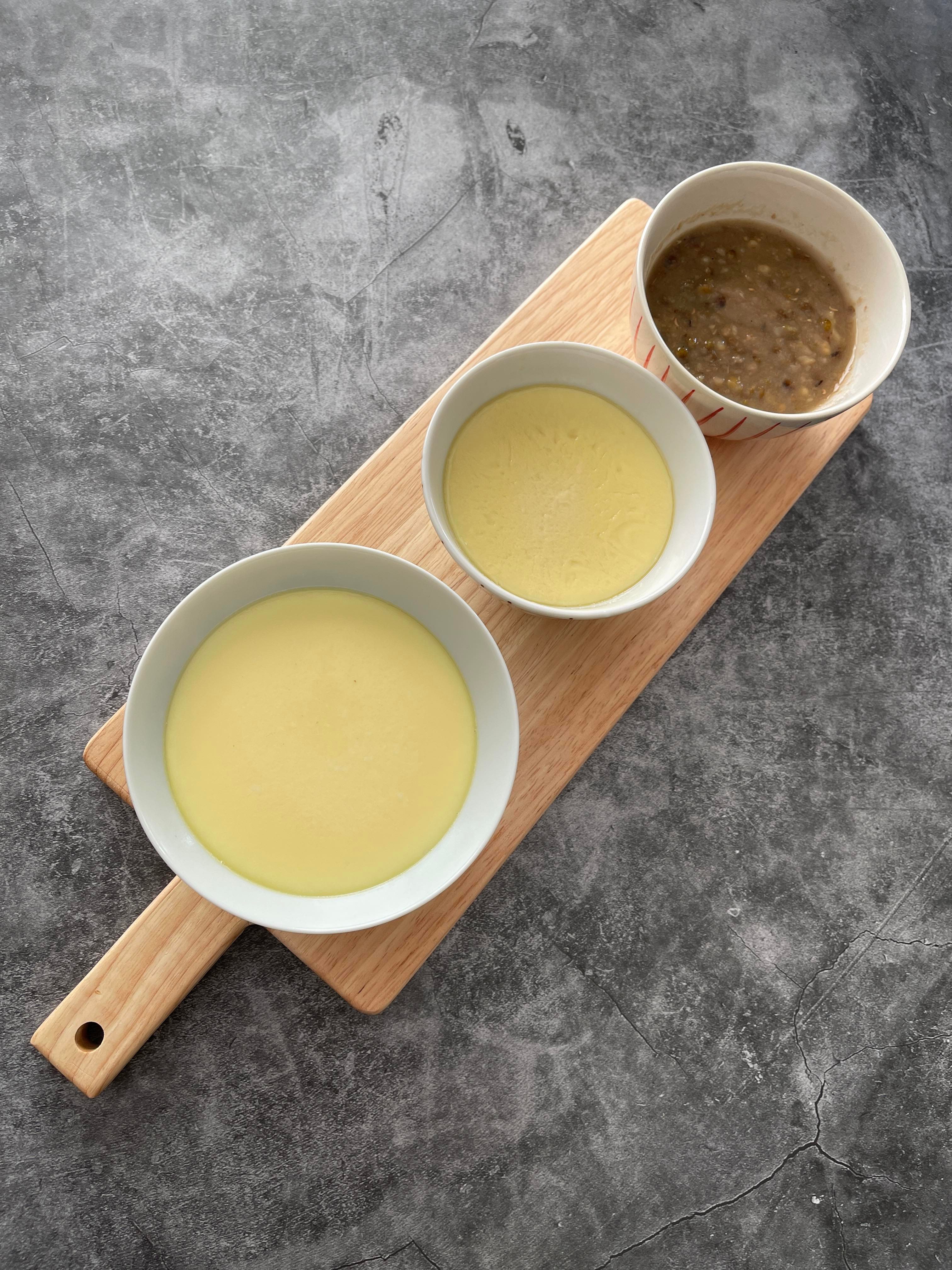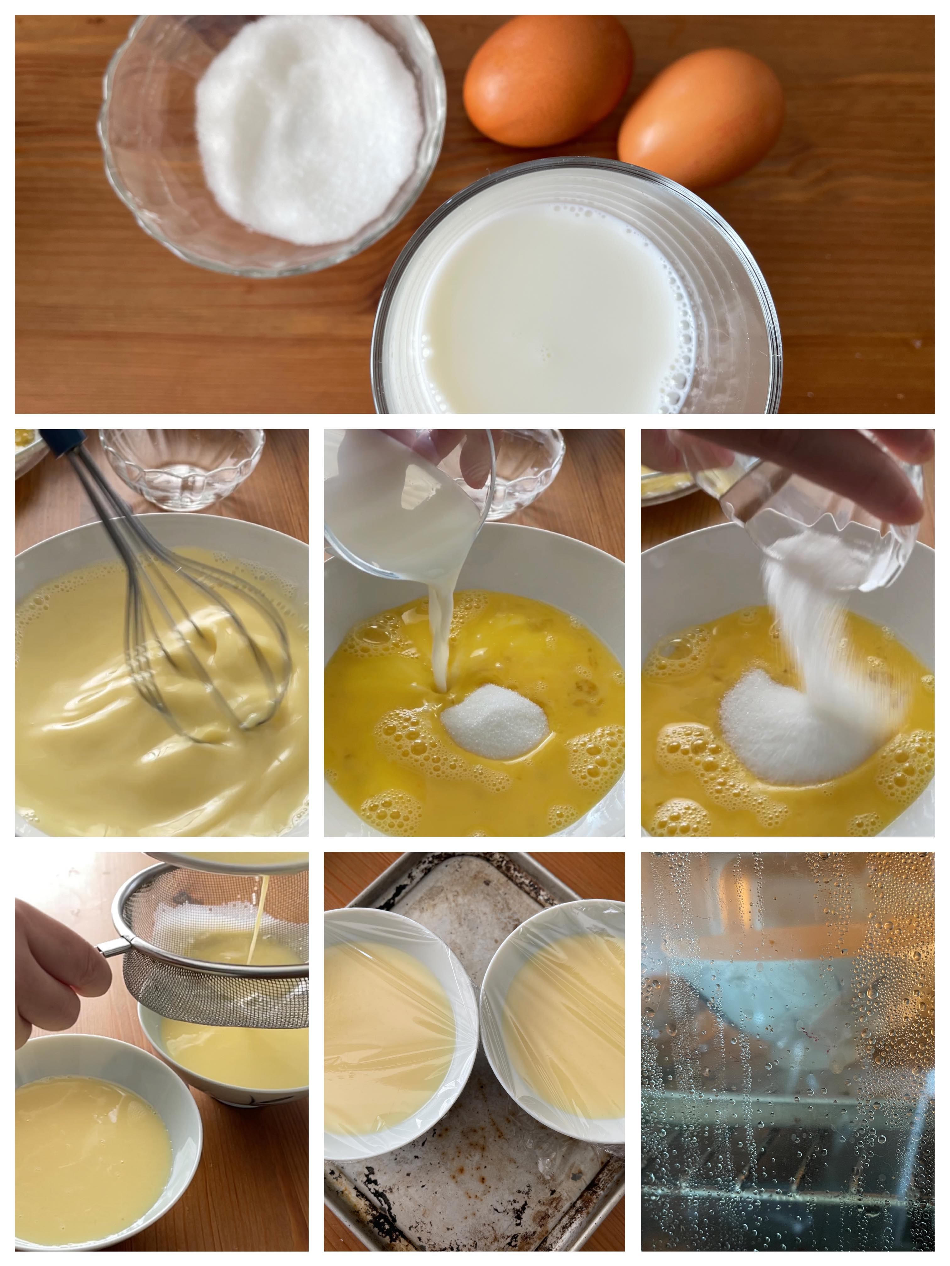 (2)將蛋漿過篩並倒入碗中,如有氣泡可以用火鎗燒走蛋漿表面的泡,再包上耐熱保鮮紙。