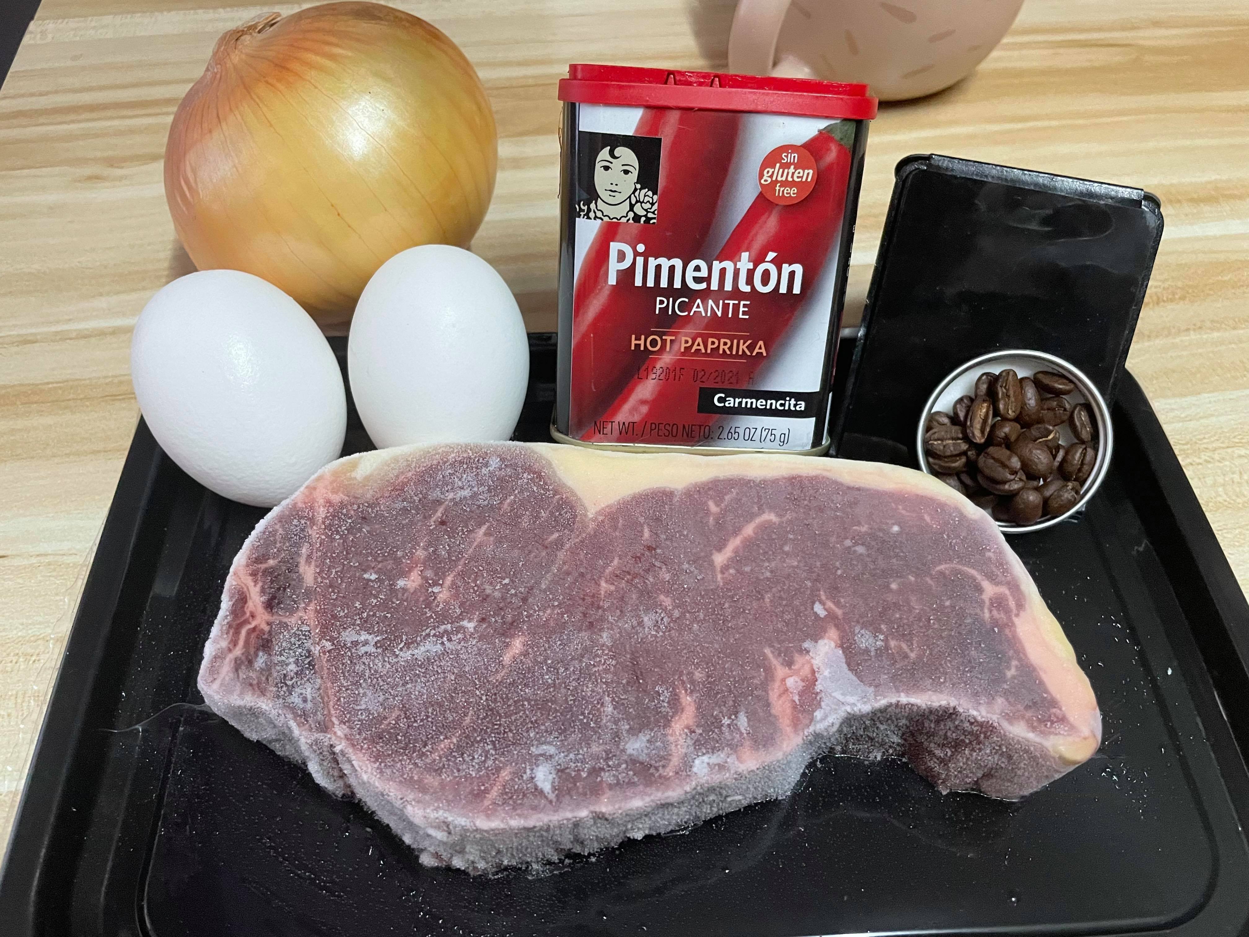 2. 咖啡粉與紅椒粉混合,撒上肉眼,輕按肉眼以上實醃料。