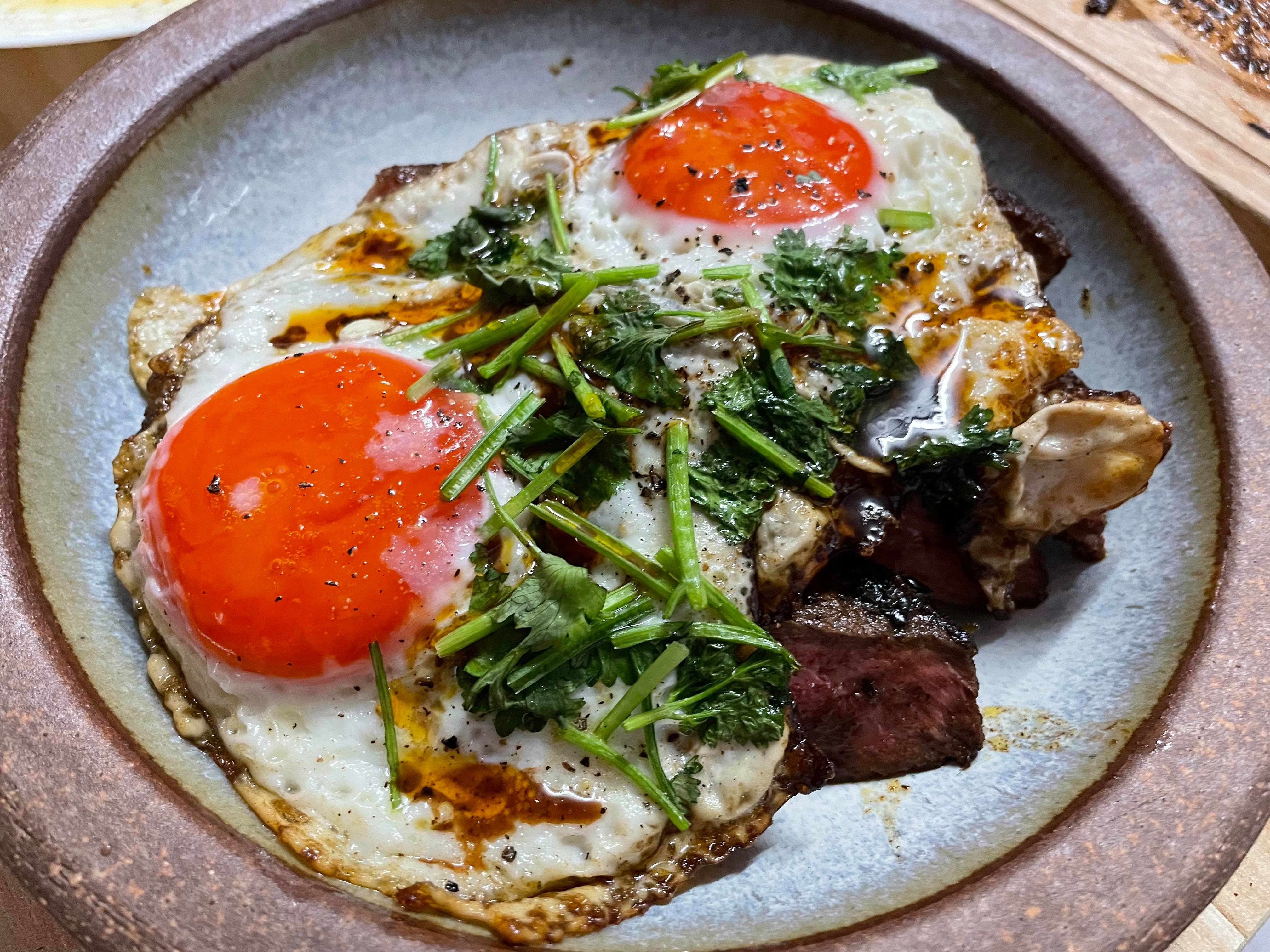 8. 肉眼切件,放上煎蛋即成。