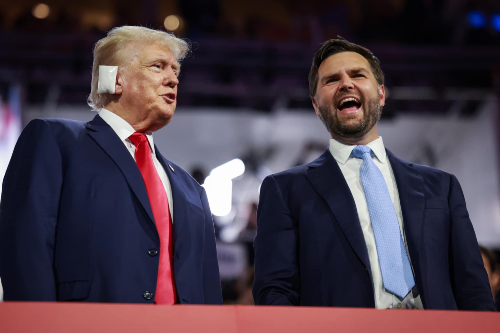 特朗普和競選拍檔萬斯一同現身共和黨全國代表大會,是特朗普自槍擊事件後首次公開露面,他的右耳蓋上紗布。