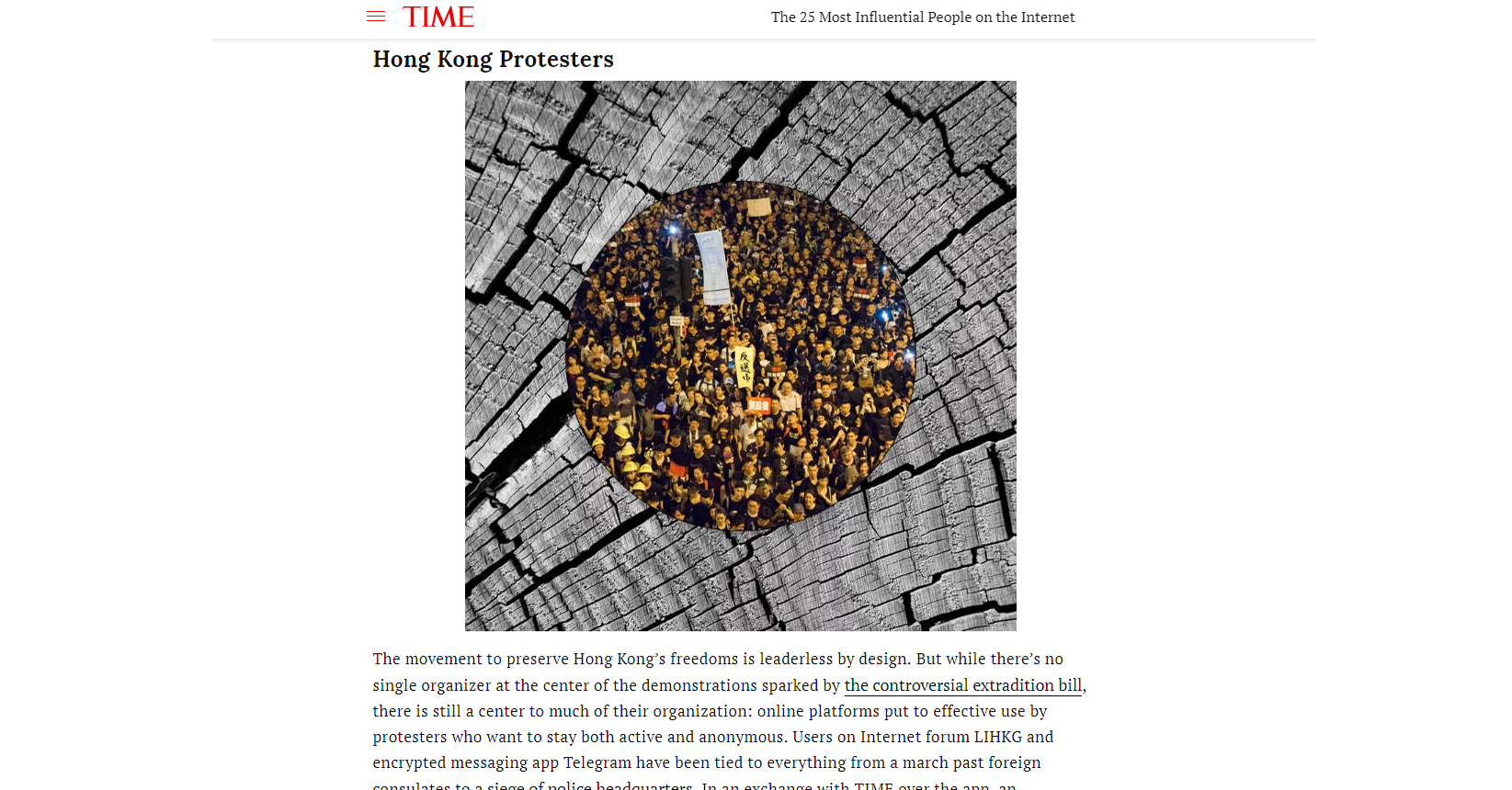 美國《時代雜誌》(TIME)公布2019年度互聯網25大具影響力人物,香港示威者因善用網上平台,組織反《逃犯條例》行動及為示威者提供支援,成為榜上有名的群體。