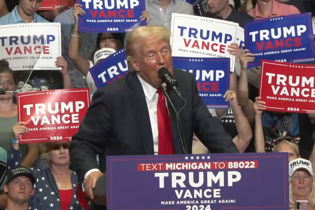 特朗普在搖擺州密歇根州向數以千計支持者演說,他的右耳沒有再貼紗布,換成一小塊膠布。他的競選副手萬斯,亦首次與他同台造勢。