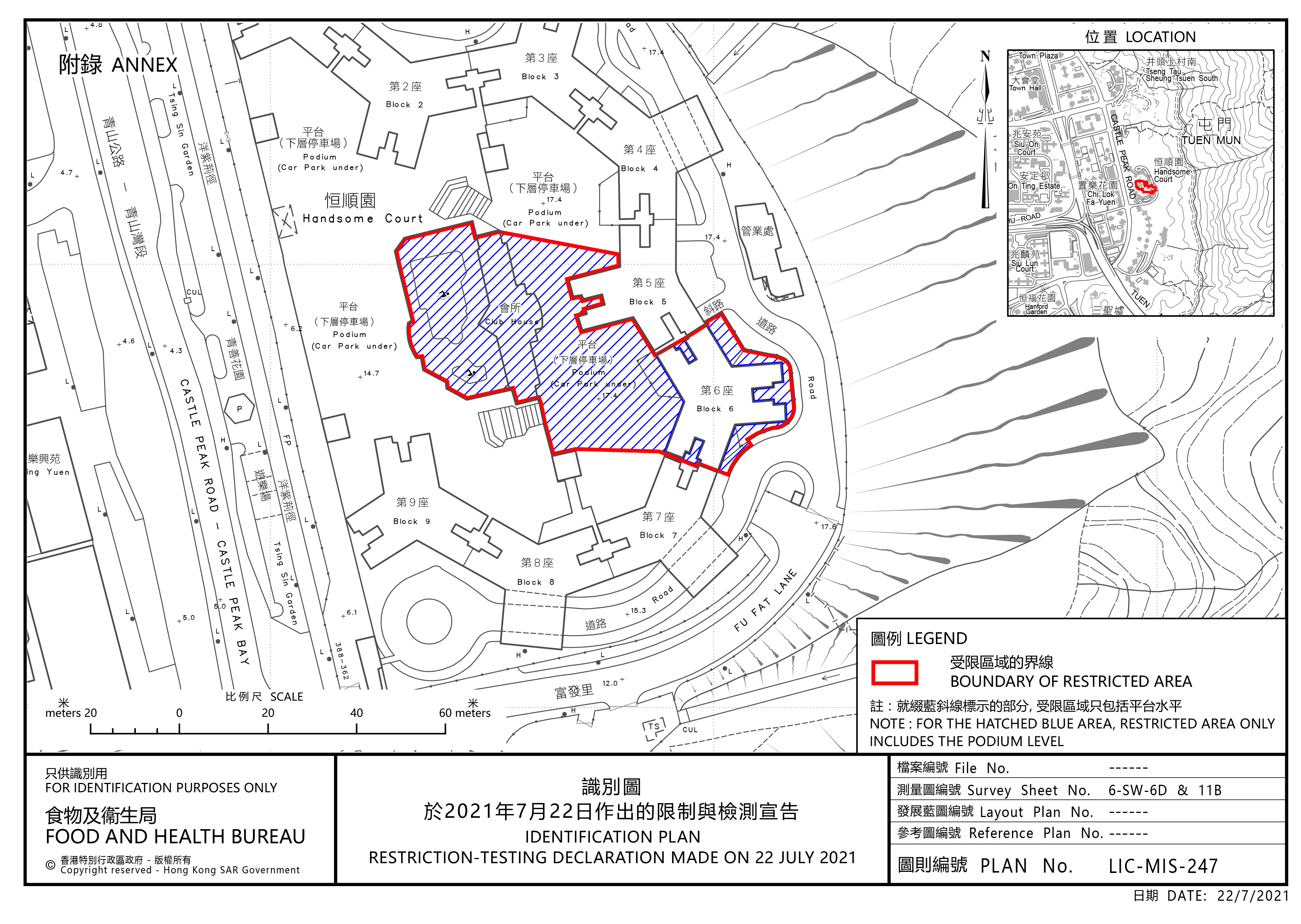 政府今日(7月22日)再引用《預防及控制疾病(對若干人士強制檢測)規例》(第599J章),作出限制與檢測宣告,自晚上7時30分起限制在屯門指明「受限區域」,即屯門青山公路388號恒順園第6座內的人士須留在其處所並接受強制檢測。受檢人士須在其處所等候,直至「受限區域」內所有已識別的受檢人士完成檢測,而相關檢測結果亦已獲大致確定,方可離開其處所。政府目標是在明日(7月23日)上午約7時完成此行動。