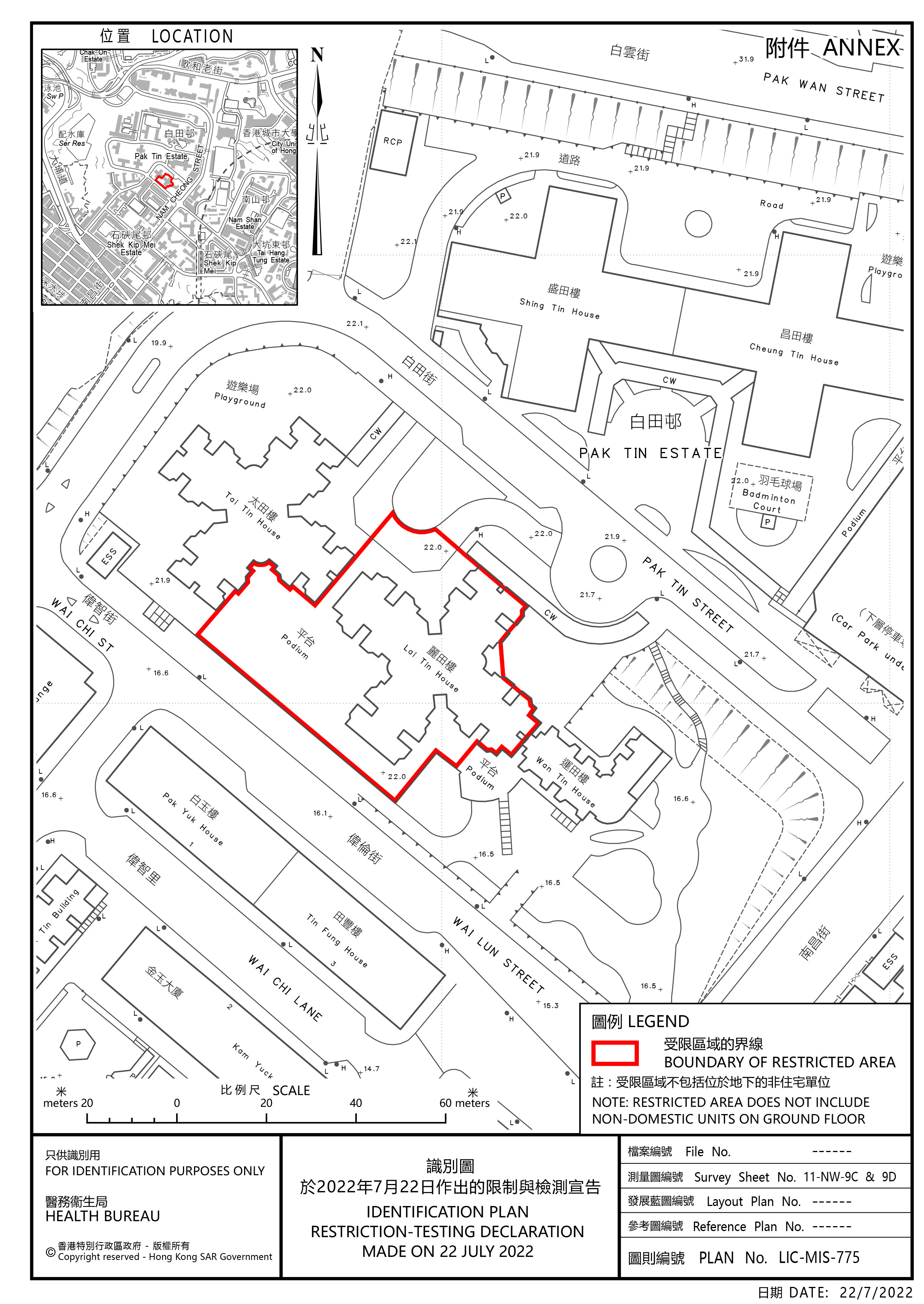 政府今日(7月22日)引用《預防及控制疾病(對若干人士強制檢測)規例》(第599J章),作出限制與檢測宣告,自下午5時起限制在深水埗指明「受限區域」,即深水埗白田邨麗田樓內的人士,須留在其處所並接受強制檢測。受檢人士須在其處所等候,直至「受限區域」內所有已識別的受檢人士完成檢測,而相關檢測結果亦已獲大致確定,方可離開其處所。政府目標是在明日(7月23日)上午約11時完成此行動。視乎檢測結果,行動或會延長。