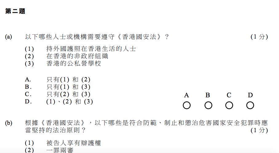 樣本試卷三條必答題中,其中第二條關於香港國安法,問及哪些人士或機構需要遵守香港國安法、如何釋除實施國安法對營商環境影響的疑慮,又要求考生解釋,學校教育對於培養香港青少年的國家觀念有幾重要等等。