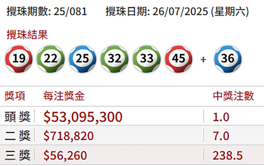 首頁港聞港聞 暑期金多寶頭獎一注中 作者:熱血編輯部 (陳五) 07-26-2025 Like Facebook Twitter 更多 Like 分享0 留言0 估計頭獎基金高達$50,000,000的暑期金多寶今晚(7月26日)攪珠,結果頭獎一注中,每10元一注派$53,095,300。